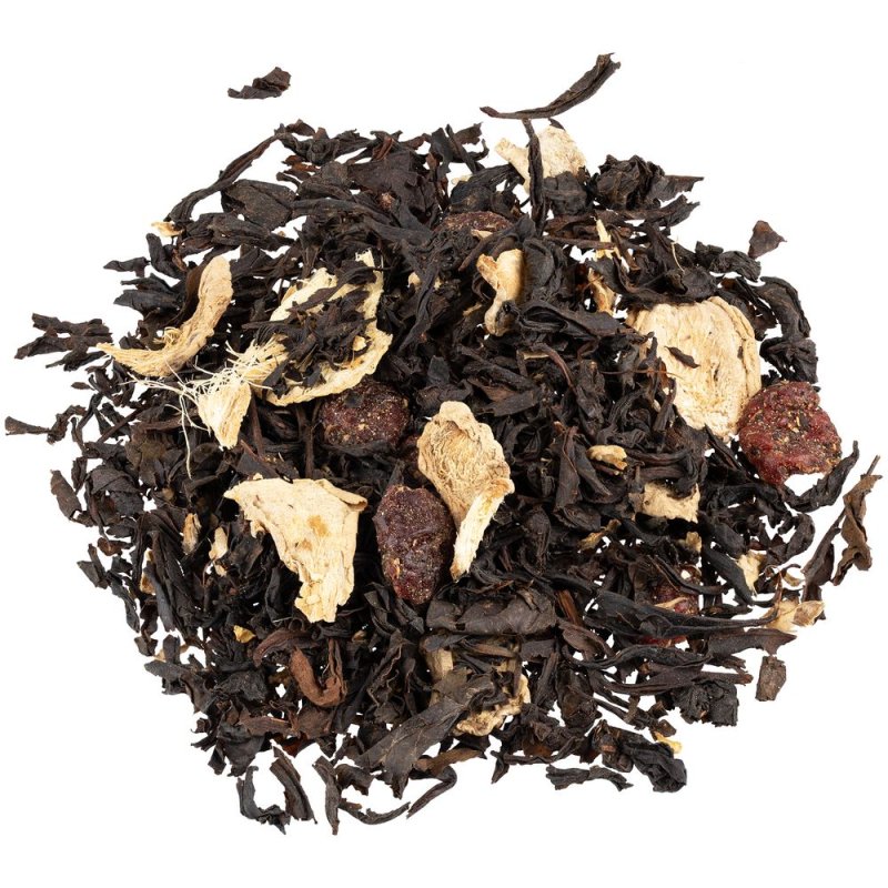 Состав: чай черный с имбирем и соком имбиря (чай черный байховый крупнолистовой, кусочки имбиря, сок имбиря), клюква сушеная, ароматизатор натуральный «Клюква».