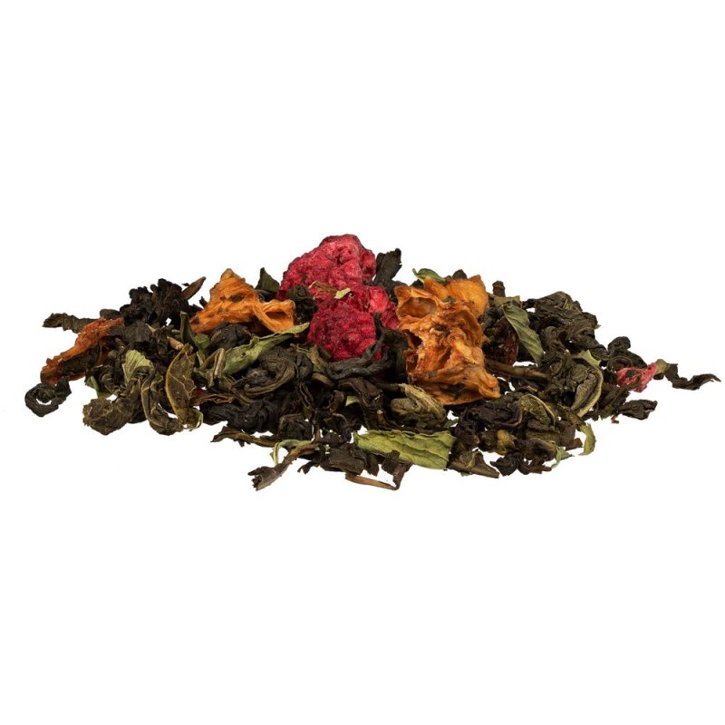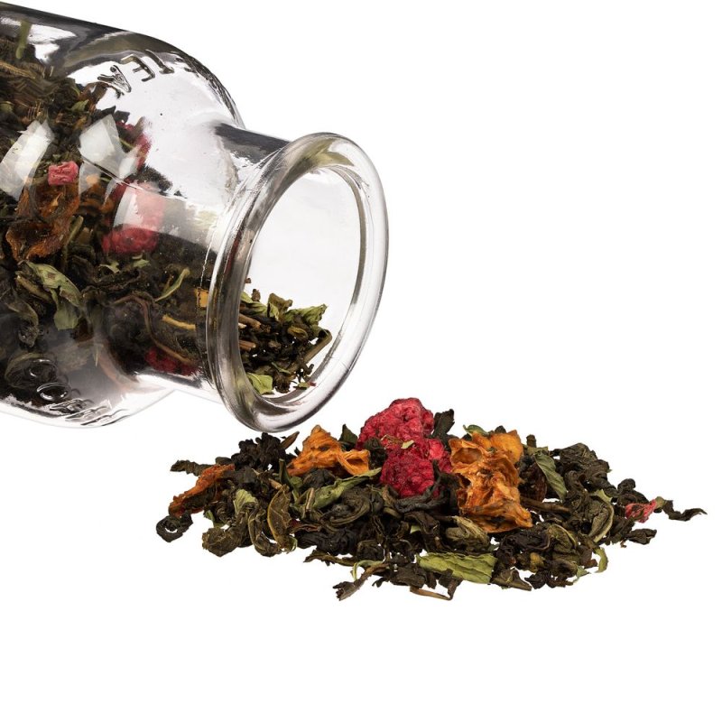 Состав: чай зеленый с ананасом и соком ананаса (чай зеленый байховый крупнолистовой, кусочки ананаса, сок ананаса), малина сублимированная, мята сушеная, ароматизатор натуральный «малина».