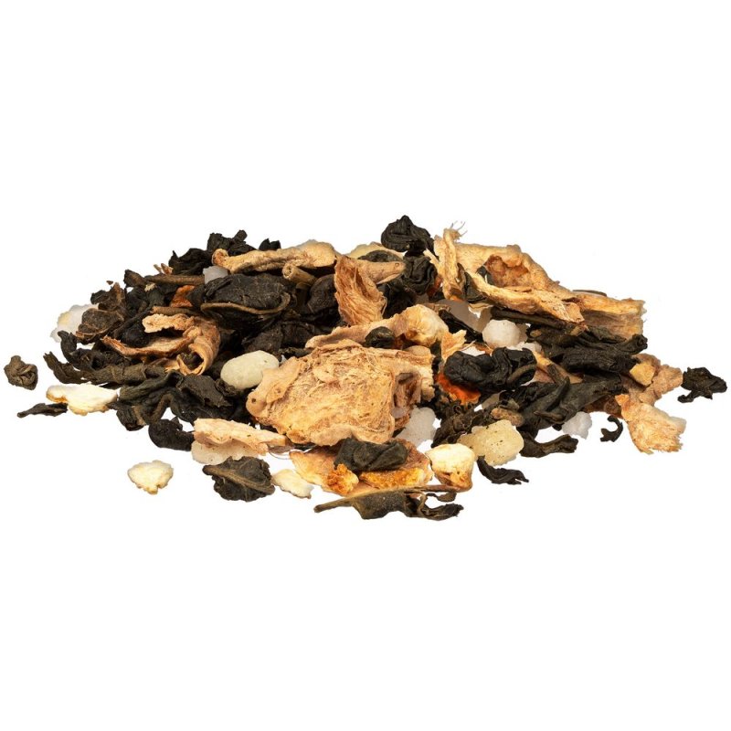 Зеленый крупнолистовой чай с кусочками имбиря, апельсином и медовыми гранулами обладает многогранной палитрой вкуса и аромата. В состав чая входят только натуральные ингредиенты, а чайные листья предварительно вымачиваются в имбирном соке: вкус напитка становится особо насыщенным и обогащенным.