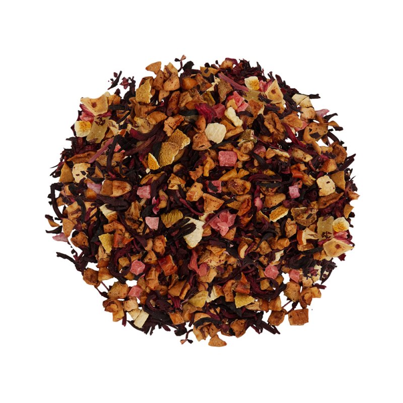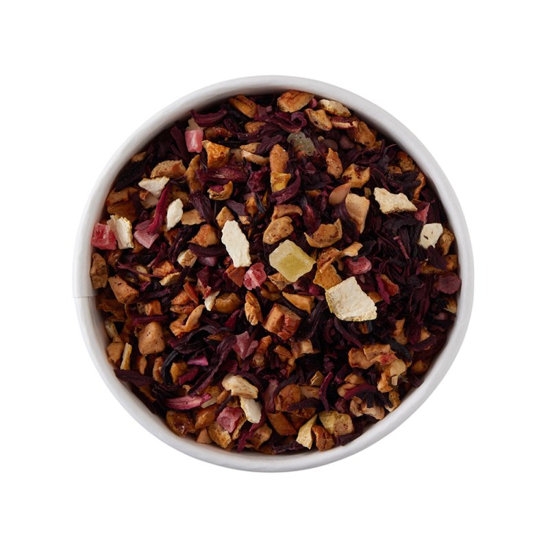 Яркий фруктовый чай с насыщенными вишнёвыми нотами и лёгкой пряной глубиной. Этот чай раскрывается сочной гаммой вкусов: яркая кислинка суданской розы играет в дуэте со сладостью яблок и ананаса, а солнечная цедра апельсина добавляет свежий цитрусовый акцент. Главная нота — насыщенная вишня, которую мягко обрамляют сливочные оттенки, превращая напиток в настоящий фруктовый десерт в чашке. Настой получается рубиновым, аромат — густым и праздничным, вкус — насыщенным и гармоничным.