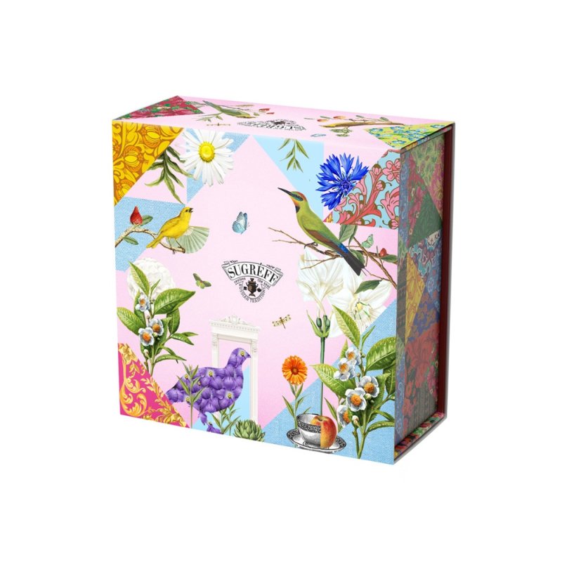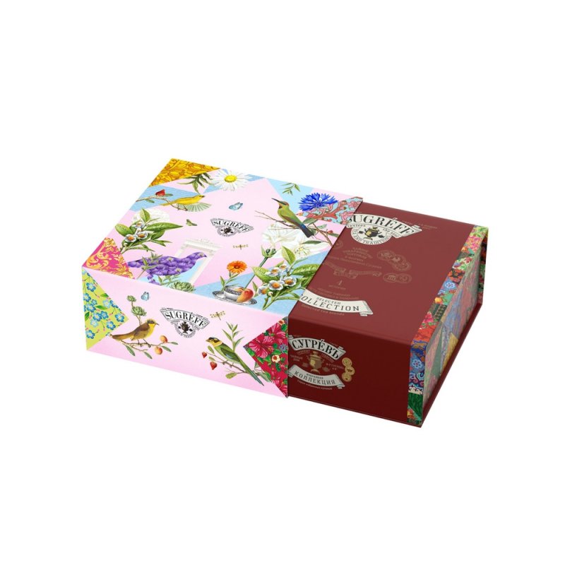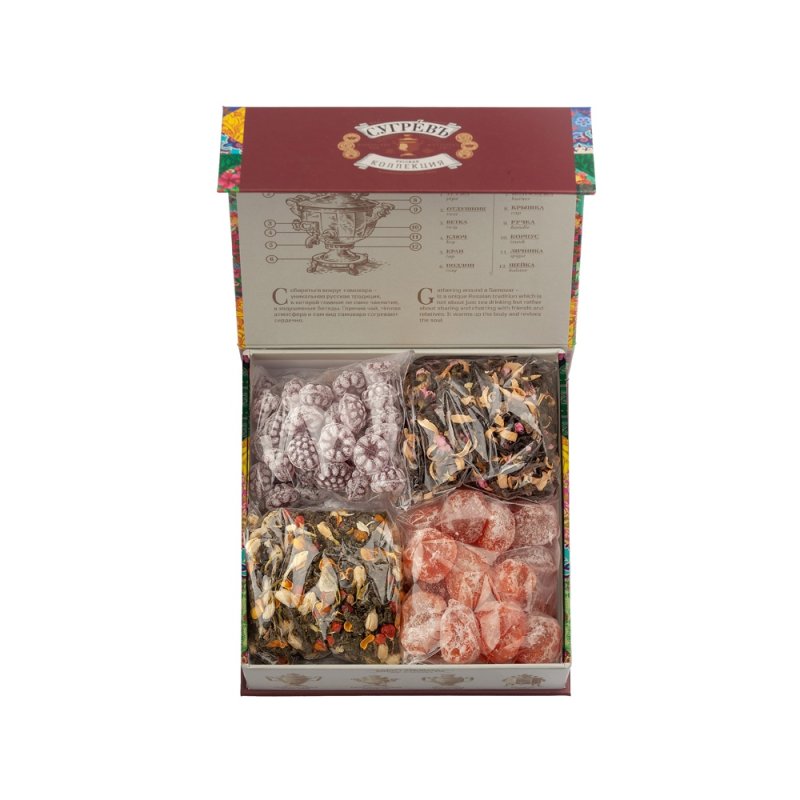 Купажи чая составлены так, чтобы сочетать вкус и аромат отборных сортов китайского и индийского чай с красотой разноцветных лепестков мальвы, лилии, жасмина и акации. В набор также входят монпансье со вкусом чёрной смородины и цукаты из кумквата. Внутри шкатулки находится мини-открытка, которую покупатель может подписать.