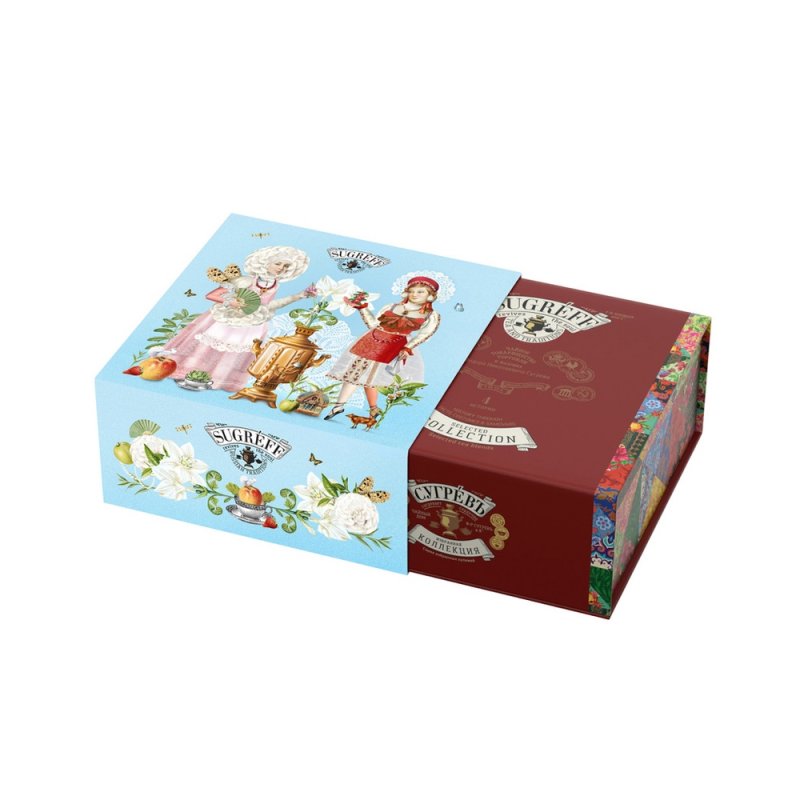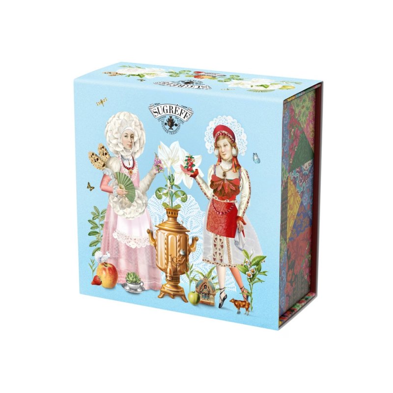 Купажи чая составлены так, чтобы сочетать вкус и аромат отборных сортов китайского и индийского чай с красотой разноцветных лепестков календулы, мальвы, цветов яблони, жасмина, акации и других. Внутри шкатулки находится мини-открытка, которую покупатель может подписать.