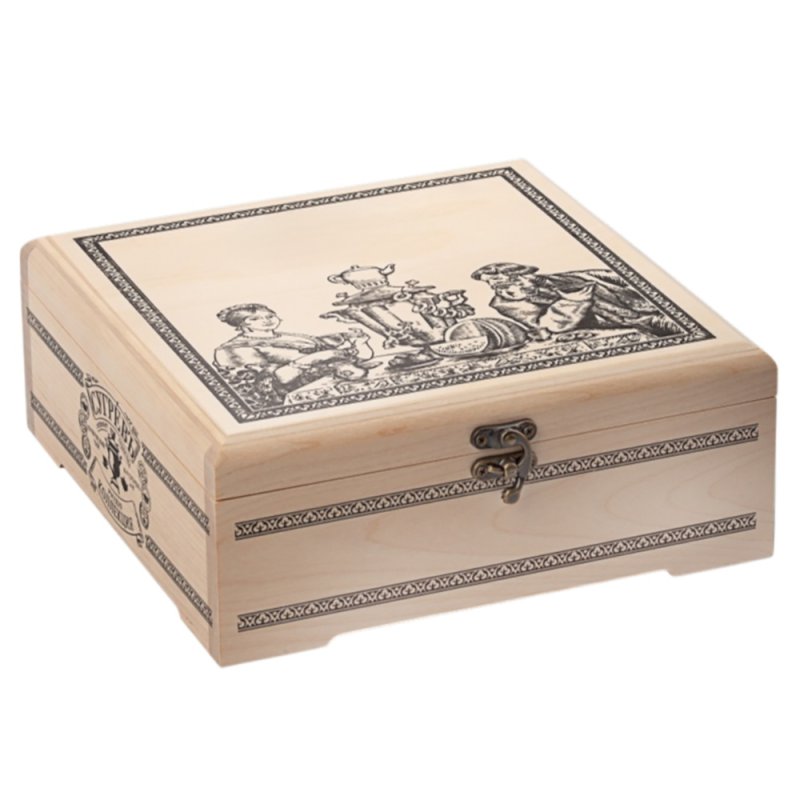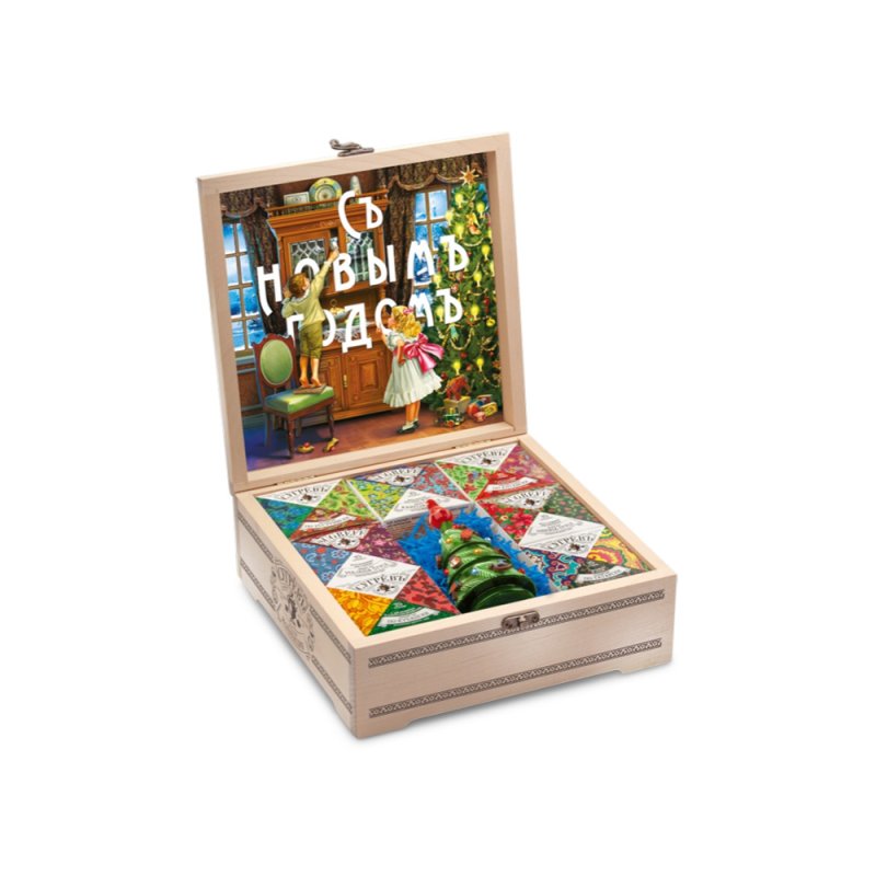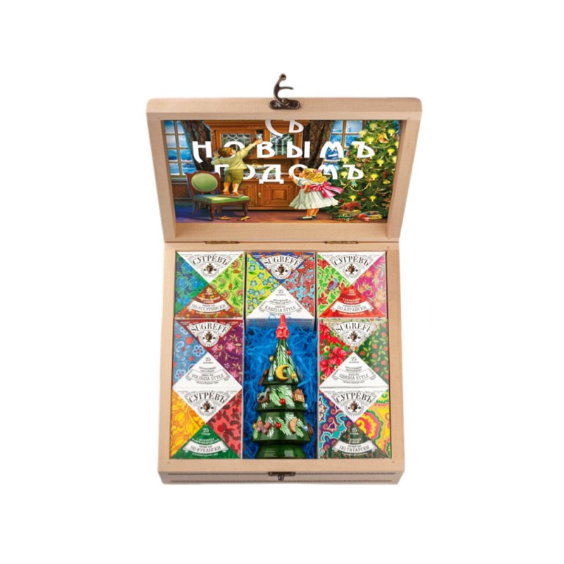 Подарочный набор из семи эксклюзивных купажей листового чая, характерных для разных регионов России и елки ручной работы с натуральным вареньем, в сувенирной шкатулке из массива берёзы.