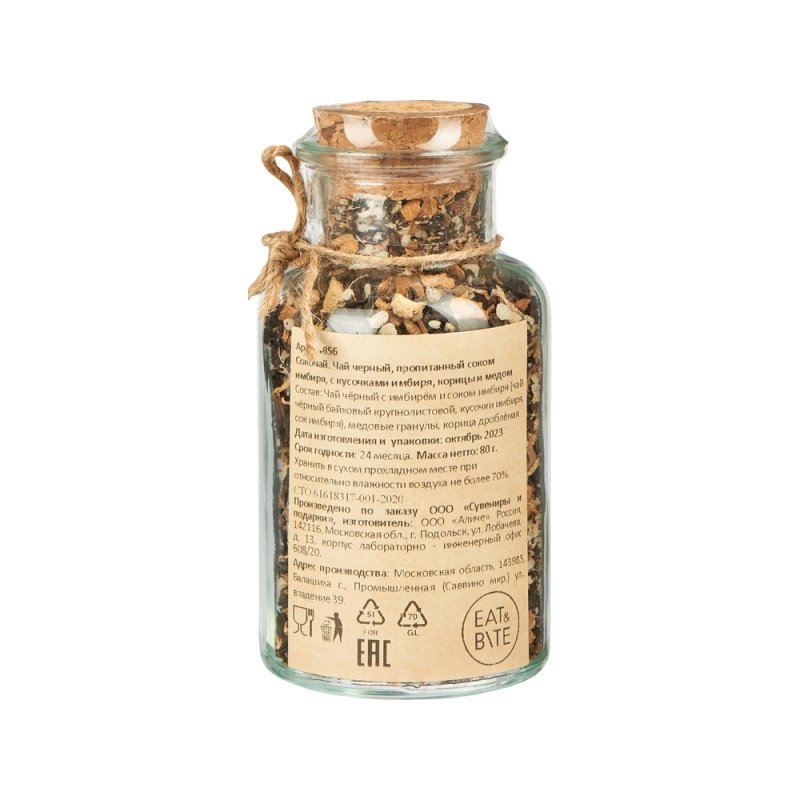 - Состав:чай чёрный байховый крупнолистовой, кусочки имбиря, сок имбиря, медовые гранулы, корица дроблёная