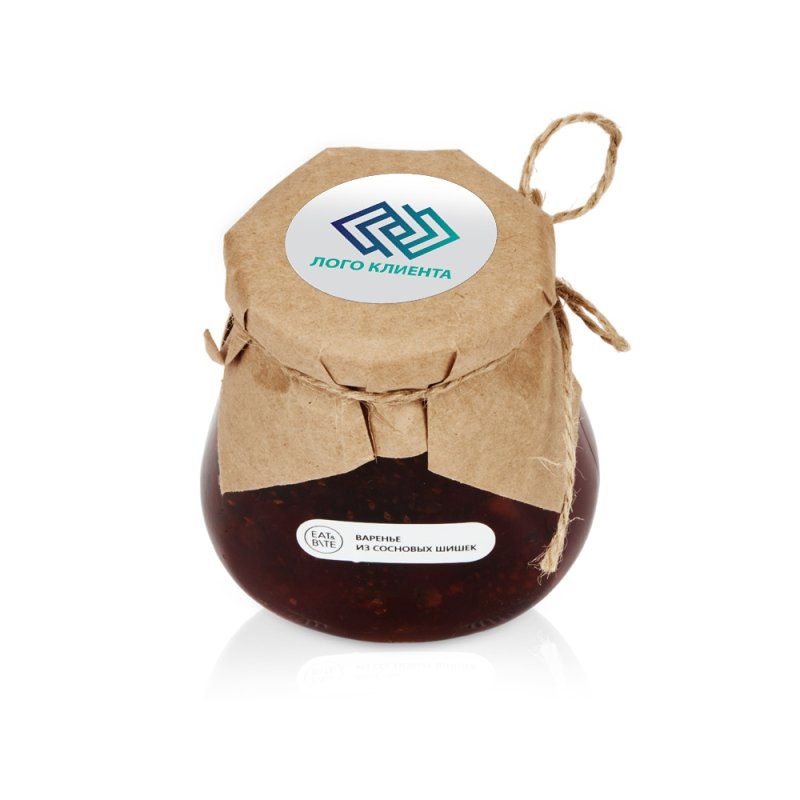 Банка варенья обернута крафт-бумагой, на которую возможно сделать нанесение корпоративного логотипа.