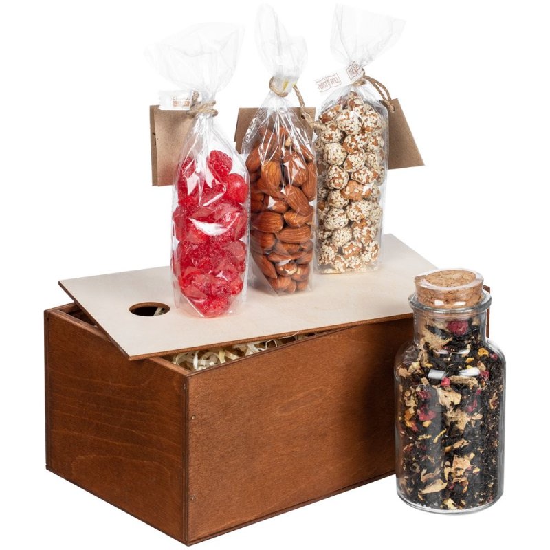 - Материал:чай - стекло, пробка; ящик, наполнитель - дерево; арахис, вишня, миндаль - полиэтилен