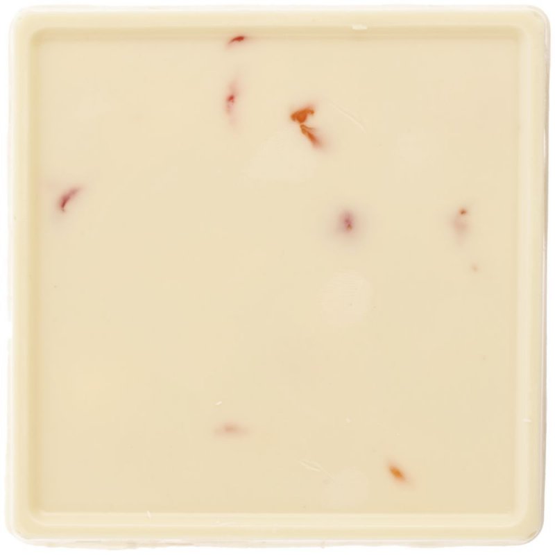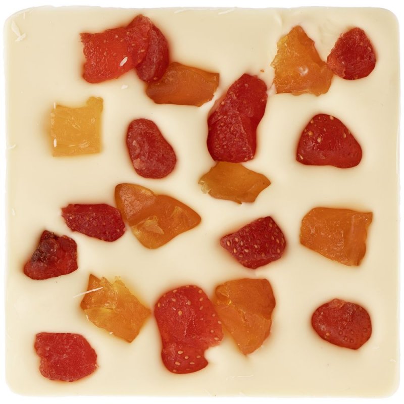 Белый шоколад ручной работы, изготовленный по классической бельгийской технологии, с кусочками сушеного персика и клубники.