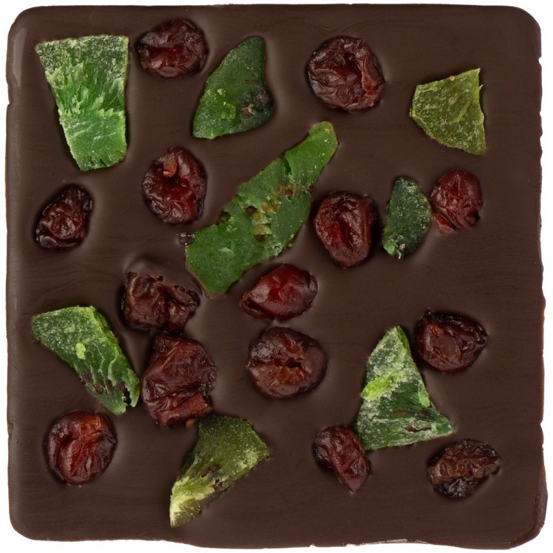Шоколад ручной работы, изготовленный по классической бельгийской технологии, с кусочками сушеного киви и вишни.