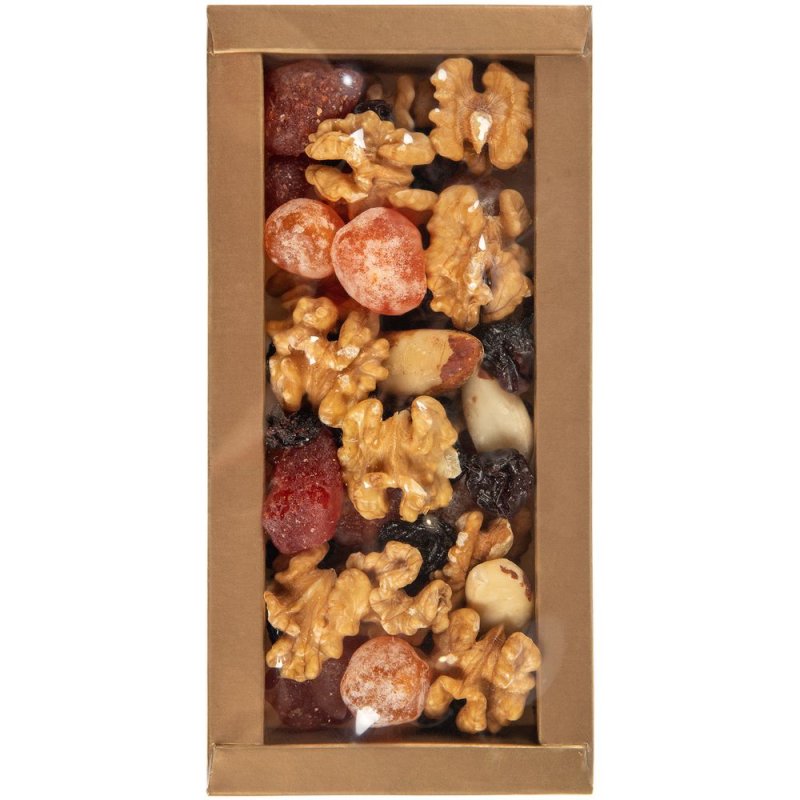Состав: ядро бразильского ореха, кумкват сушеный, клубника сушеная, орех грецкий, изюм темный.