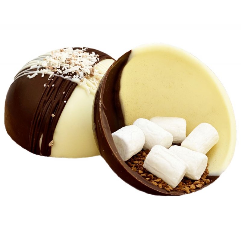 Состав: сфера из темного и белого шоколада, кофе растворимый сублимированный, маршмеллоу.