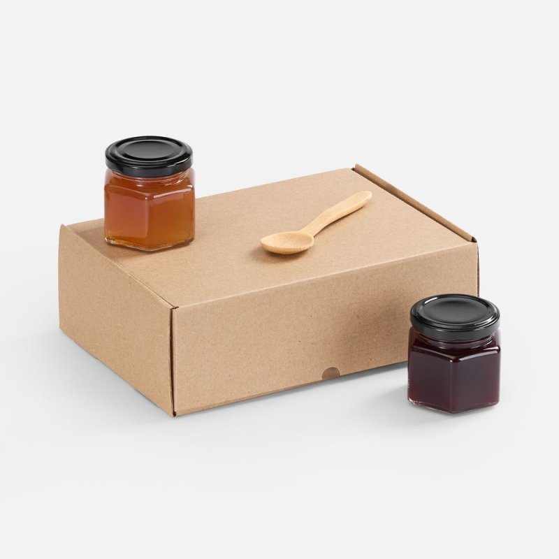 - Материал:коробка - микрогофрокартон; баночки - стекло, жесть; ложка - бамбук