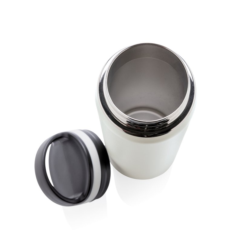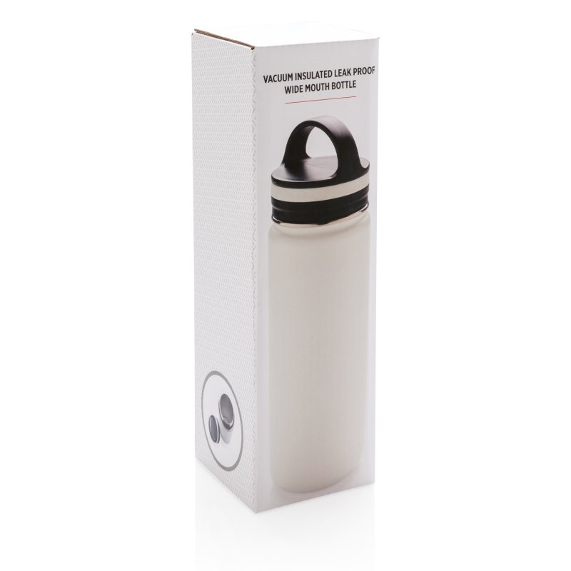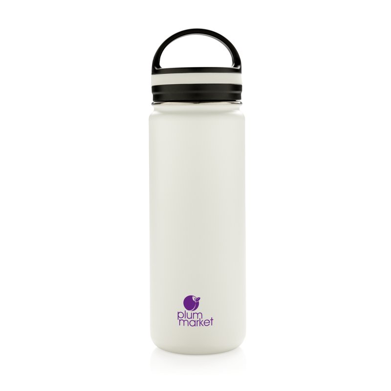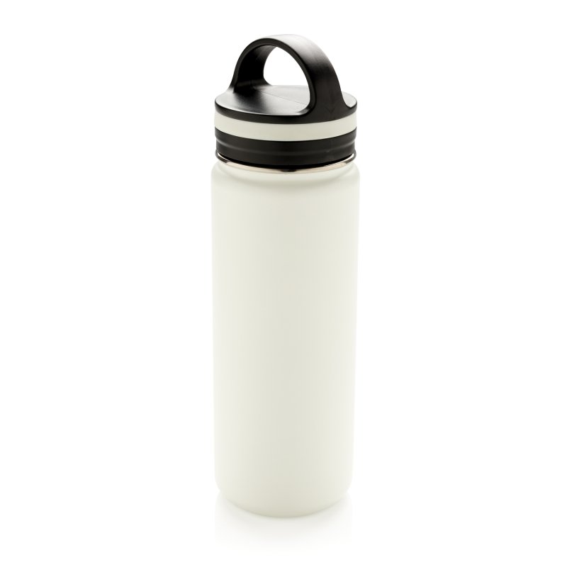 Герметичная вакуумная бутылка с двойными стенками и удобной ручкой черного цвета, изготовленная из нержавеющей стали с порошковым покрытием. Широкое горлышко для легкого наполнения и очистки. Идеально подходит для длительных прогулок, пляжного отдыха или даже офиса. Внутренний слой из стали марки 304 и внешний марки 201 сохраняет ваши напитки горячими до 5 часов и холодными до 15 часов. Объем: 500 мл.
