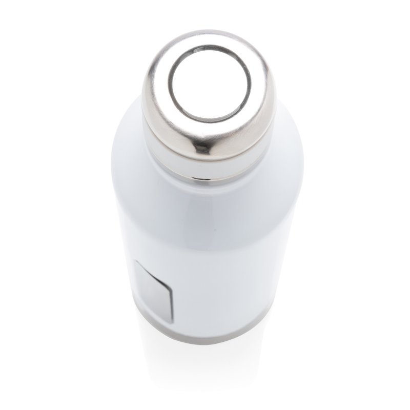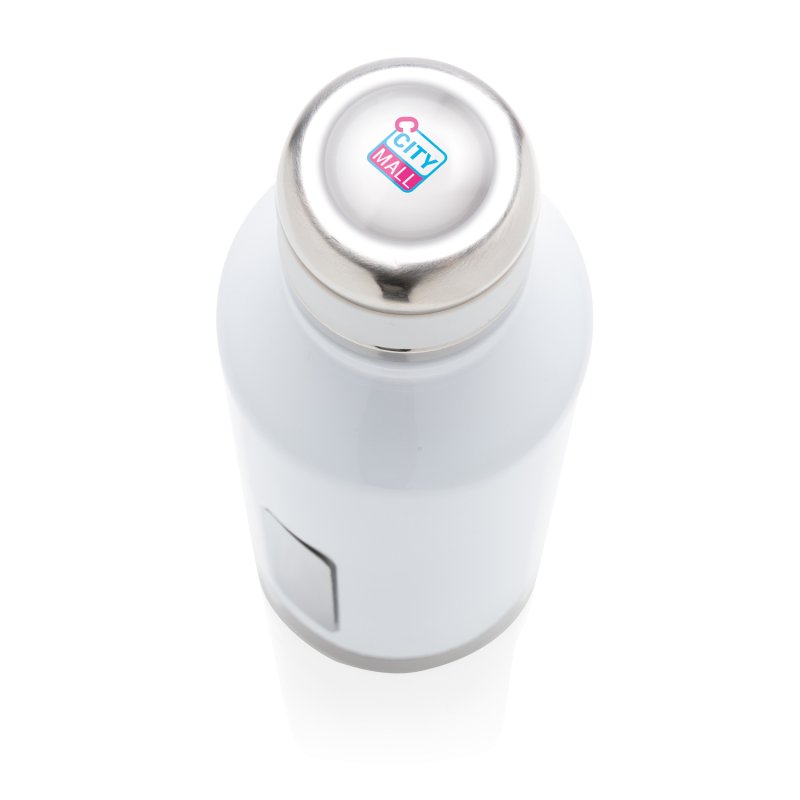 Герметичная вакуумная бутылка с закручивающейся крышкой. На лицевой стороне расположен шильдик под нанесение логотипа. Внутренняя часть из 304 нержавеющей стали и поверхность из 201 нержавеющей стали сохранят ваши напитки горячими до 5 часов и холодными до 15 часов. Объем 500 мл.