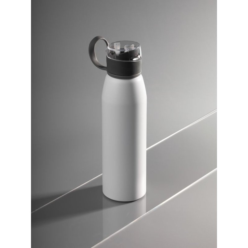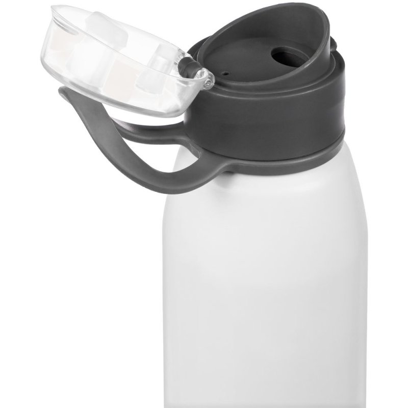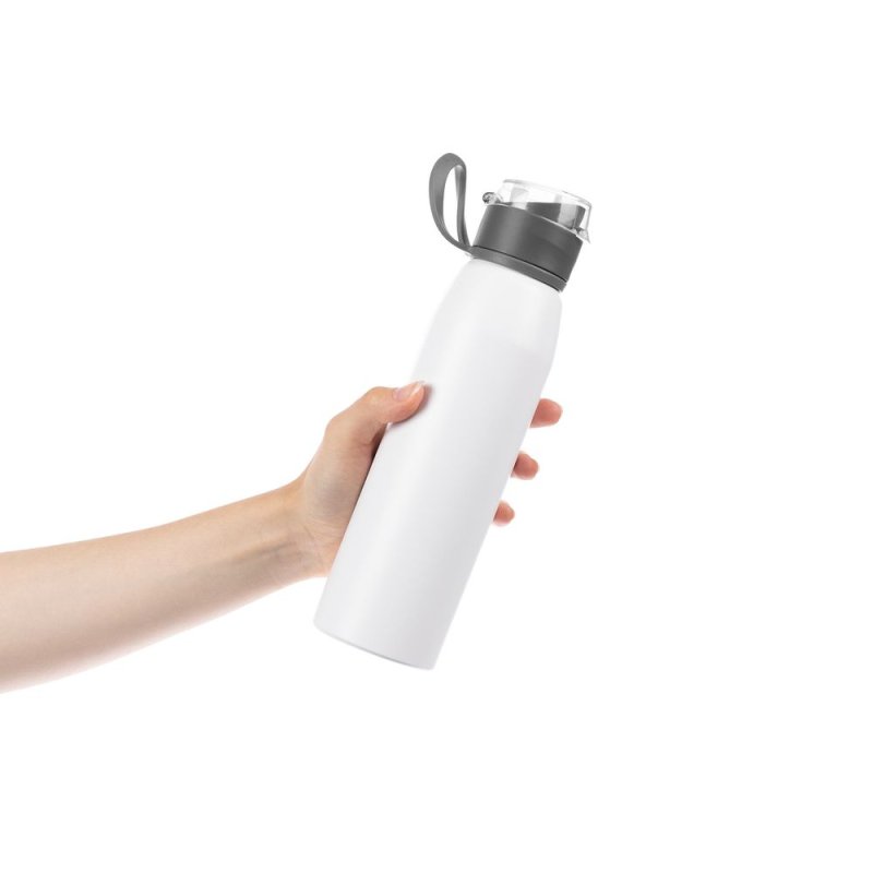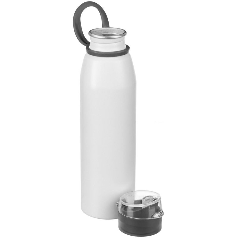 Легкая бутылка для спорта с откидной крышкой и силиконовой петлей для транспортировки.