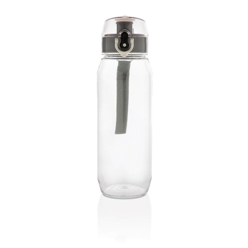 Бутылка для воды Tritan объемом 800 мл. Прозрачная бутылка из экологичного материала, который не впитывает запахи и не содержит бисфенол. У бутылки удобная крышка, которая открывается нажатием на кнопку, есть фиксатор, который не позволит бутылке случайно открыться во время движения. В комплект входит ремешок для запястья.