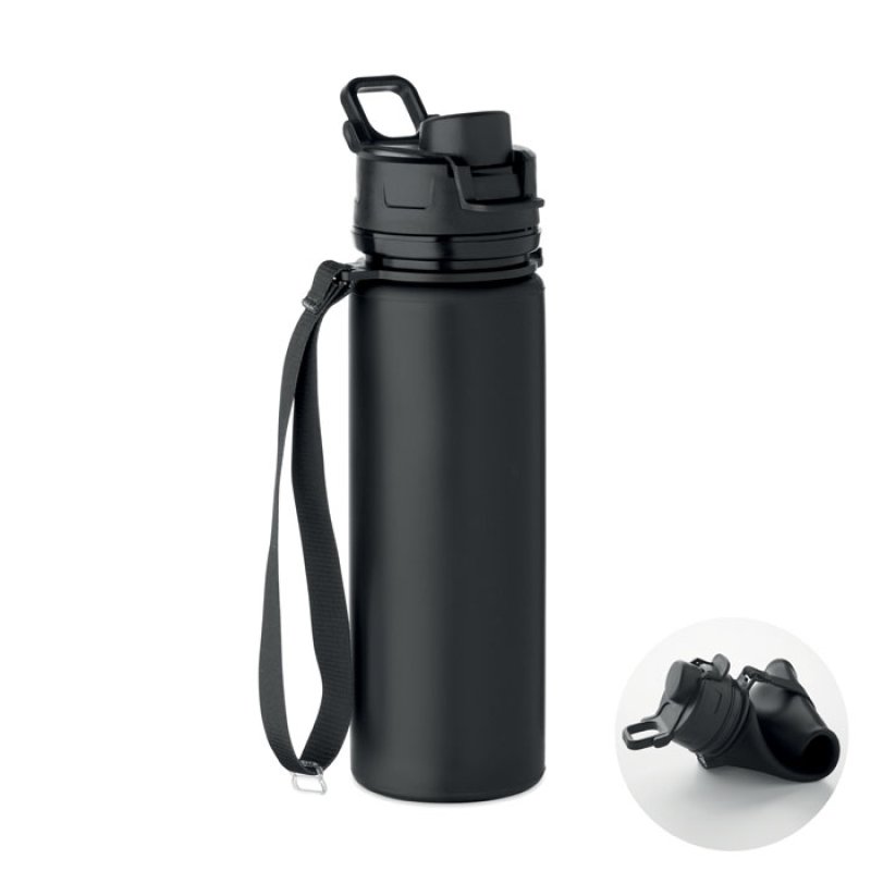 Складная силиконовая спортивная бутылка с крышкой из полипропилена (PP), ручкой, полиэстеровым ремешком и прозрачной застежкой для фиксации в сложенном виде. Герметичная. Объём: 500 мл.