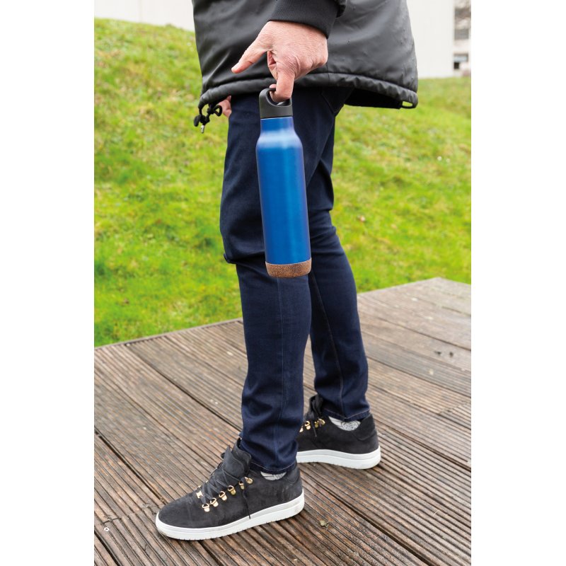 Герметичная вакуумная бутылка.Внутренняя стенка бутылки выполнена из нержавеющей стали марки 304, внешняя – из нержавеющей стали марки 201. Низ бутылки сделан из коры пробкового дуба – одного из самых лёгких, натуральных природных материалов. Пробка - 100% экологичный материал, а главное, что его производство не вредит деревьям. Благодаря своим уникальным свойствам пробка не впитывает влагу, обладает хорошей термоизоляцией и приятна на ощупь. Бутылка сохранит ваши напитки теплыми до 5 часов и прохладными до 15 часов. Объем: 600 мл