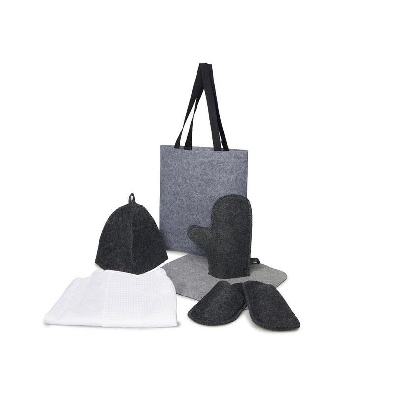 Банный набор Healing для настоящего ценителя сауны: коврик, мужской вафельный килт, рукавица, шапка, тапочки — всё в стильном фетровом шоппере.