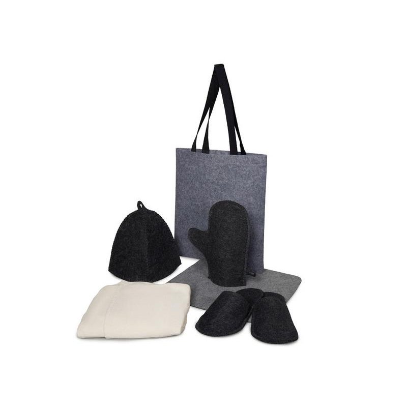 Женский банный набор Healing для комфортного отдыха: лежак для бани, холщовый килт-парео, рукавица, шапка и тапочки — всё аккуратно упаковано в стильный фетровый шоппер.