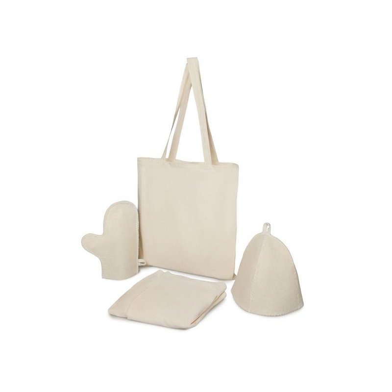 Создайте уют в парной: женский холщовый килт, шапка и рукавица — всё необходимое для отдыха, аккуратно сложено в хлопковый шоппер.