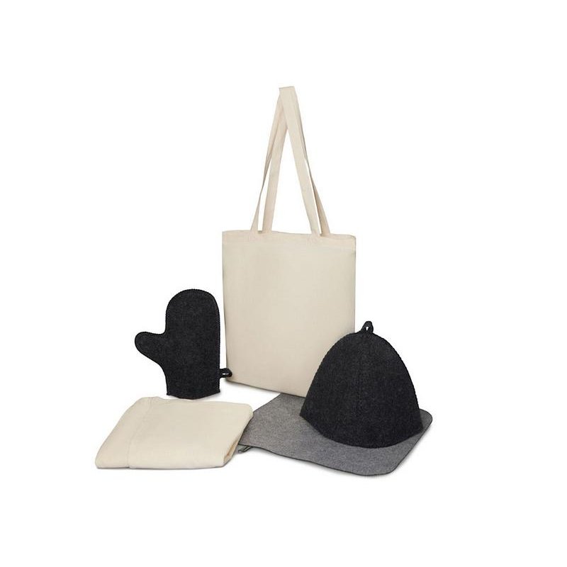 Создайте уют в парной: женский холщовый килт, шапка, коврик и рукавица — всё необходимое для отдыха, аккуратно сложено в хлопковый шоппер.