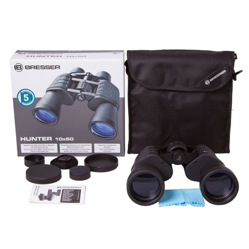 Бинокль создан на базе классической системы призм Порро, сделанных из стекла BK-7 с многослойным просветлением. Увеличение — 10x, диаметр объективов — 50 мм. Минимальное фокусное расстояние — 5 м. Бинокль имеет функцию подстройки межзрачкового расстояния и диоптрийной коррекции окуляров. Встроенная система центральной фокусировки позволит быстро настроить резкость.