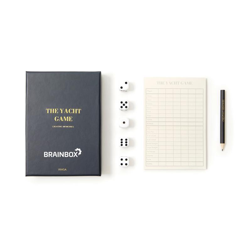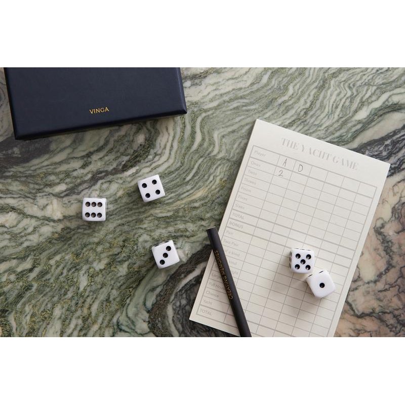 Yacht Game — это интересная настольная игра в кости, похожая на покер. Она предназначена для двух и более человек, оптимальное количество игроков — четыре. Для игры используют пять кубиков. За определенные комбинации кубиков даются очки, цель игры — набрать их наибольшую сумму. Все комбинации и цифры записываются в таблицу. В наборе от VINGA есть все необходимое для игры: кубики, блокнот и карандаш. Упакован он в подарочную коробку. Благодаря стильному и красивому виду набор Yacht станет не только интересным развлечением для вас и вашей семьи, но и элементом декора интерьера.