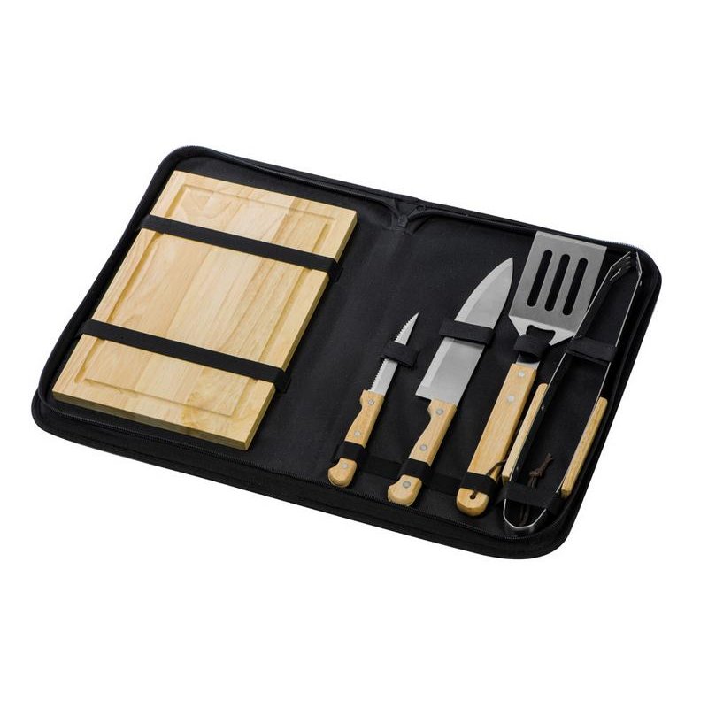 Набор из шести приспособлений для барбекю и гриля - в состав входят разделочная доска, щипцы, лопатка, нож для стейка, нож большой, а упаковывается сет в чехол из полиэстера.