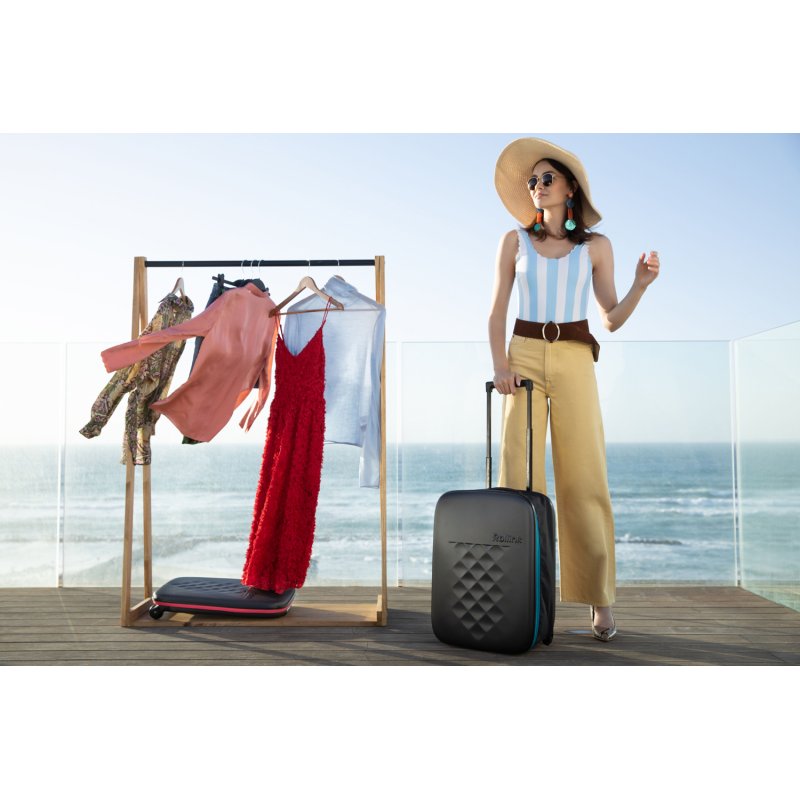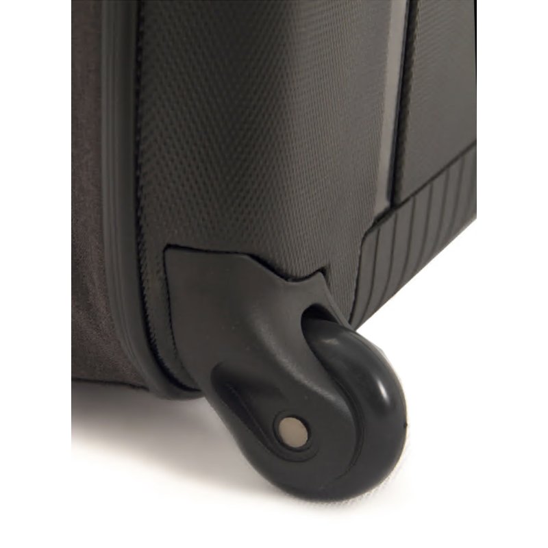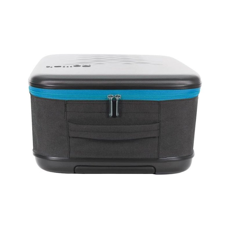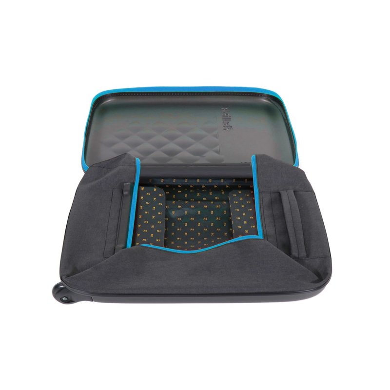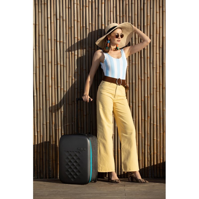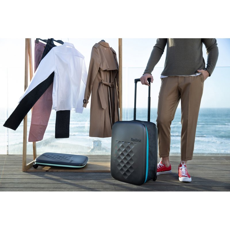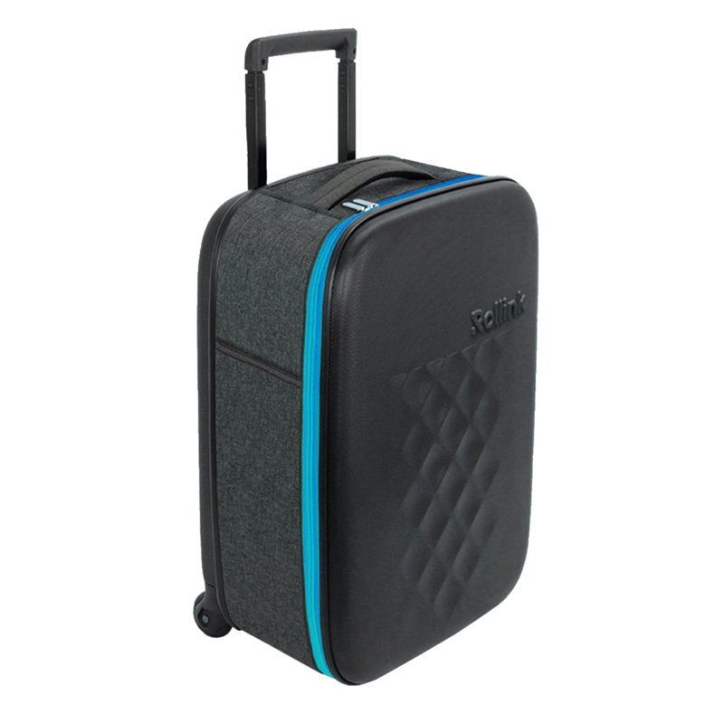 Складной легкий чемодан Rollink Earth черного цвета с синей молнией. Размер 55х40х20 см. В сложенном виде толщина составляет 5 см, с колёсами 8,5 см. Объем 40 л. Вес 2,2 кг. Жесткие стенки сделаны из ударопрочного полипропилена. Бока мягкие, из полиэстера с водоотталкивающей пропиткой. Внутри два откидывающихся жестких клапана на дне и вверху чемодана, крепятся липучками и сохраняют форму чемодана в собранном виде. Боковой easy access карман 12х19 см на липучке для документов и телефона. Удлиненная надежная выдвижная телескопическая ручка из алюминия с несколькими уровнями фиксации высоты ручки (от пола 80/94/104 см) для людей разного роста и удобная мягкая ручка сверху чемодана, чтобы было удобно нести его в руках. 2 колеса со специальным покрытием и подшипниками для более плавного и бесшумного передвижения. Надежная молния синего цвета.
