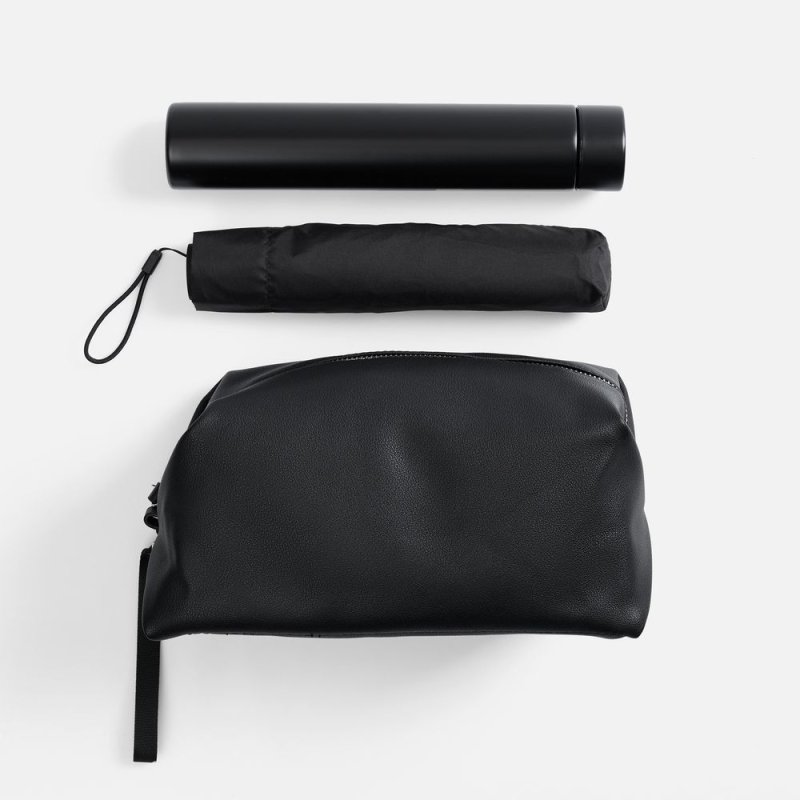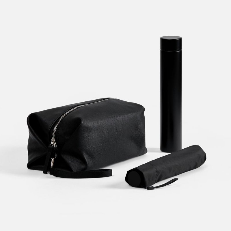 - Размеры:несессер: 22х12х12 см, в сложении 23х14х4 см; зонт: длина 49 см, диаметр купола 90 см, длина в сложении 22 см; термобутылка: диаметр 4,3 см, высота 23,5 см
