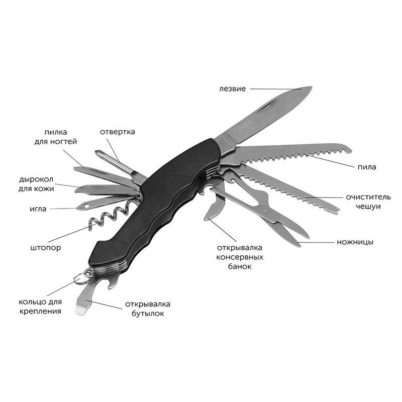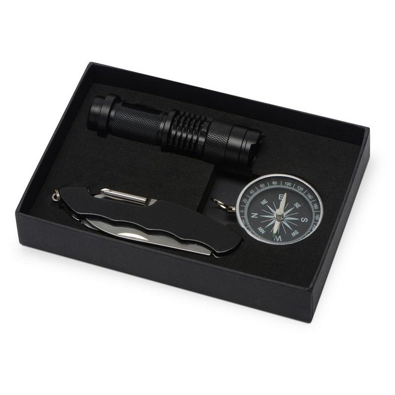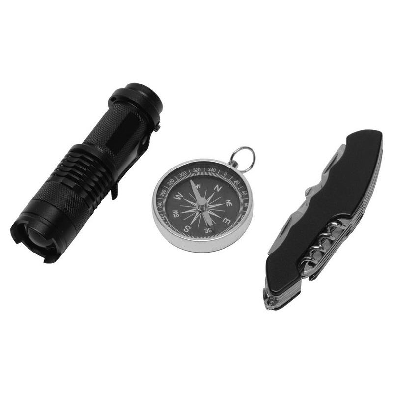- Комплектность:фонарик d2,4 х 9 см, компас d4,3 х 0,9 см, нож-мультитул 9,7 х 2,6 см (в сложенном виде)