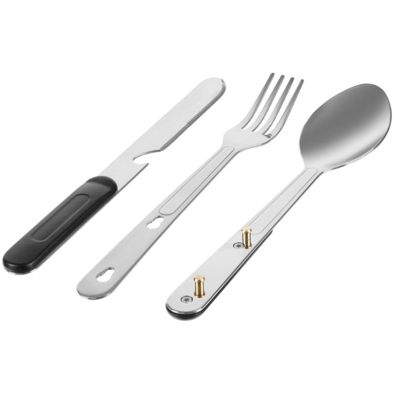 Набор столовых приборов из ложки, вилки и ножа с открывашкой с разборной конструкцией.