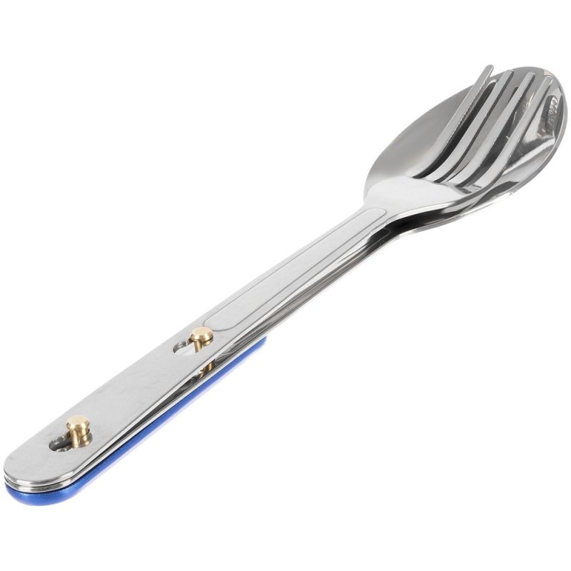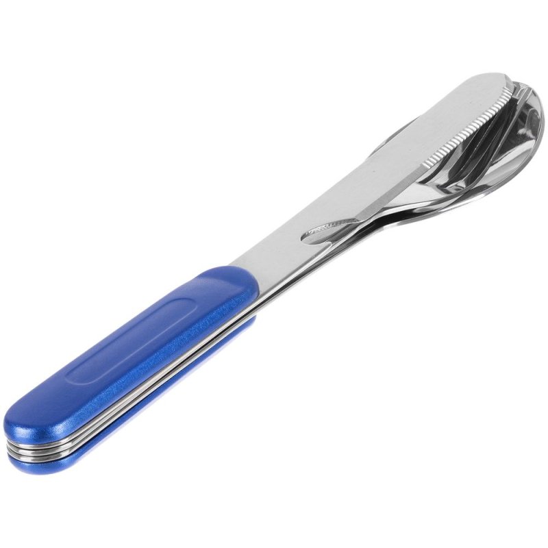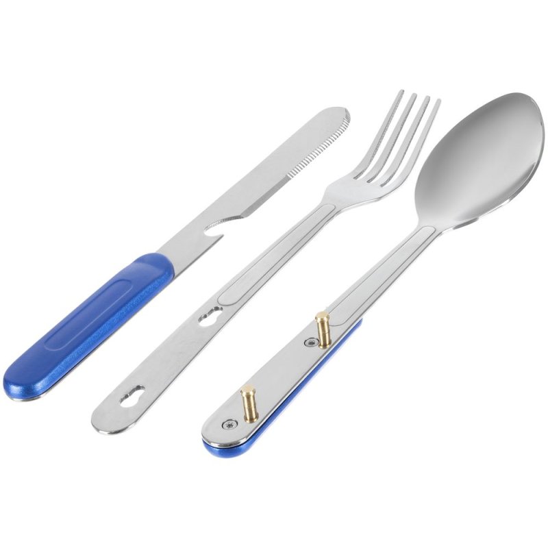 Набор столовых приборов из ложки, вилки и ножа с открывашкой с разборной конструкцией.