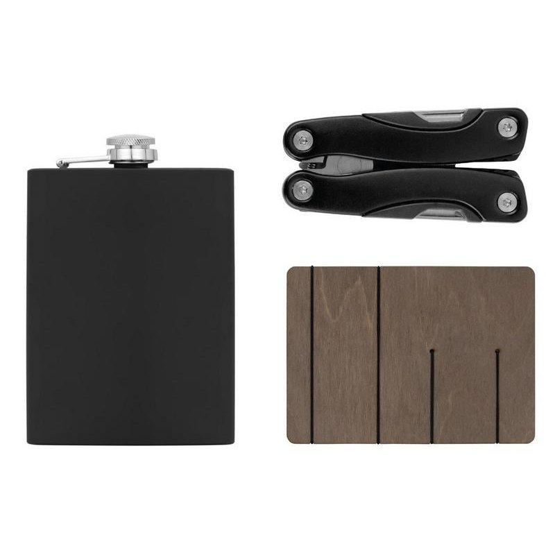 - Материал товара:ложемент - фанера, резинка, фляжка - нержавеющая cталь 304 марки с покрытием soft-touch, мультиинструмент - металл, полиэстер, коробка - картон