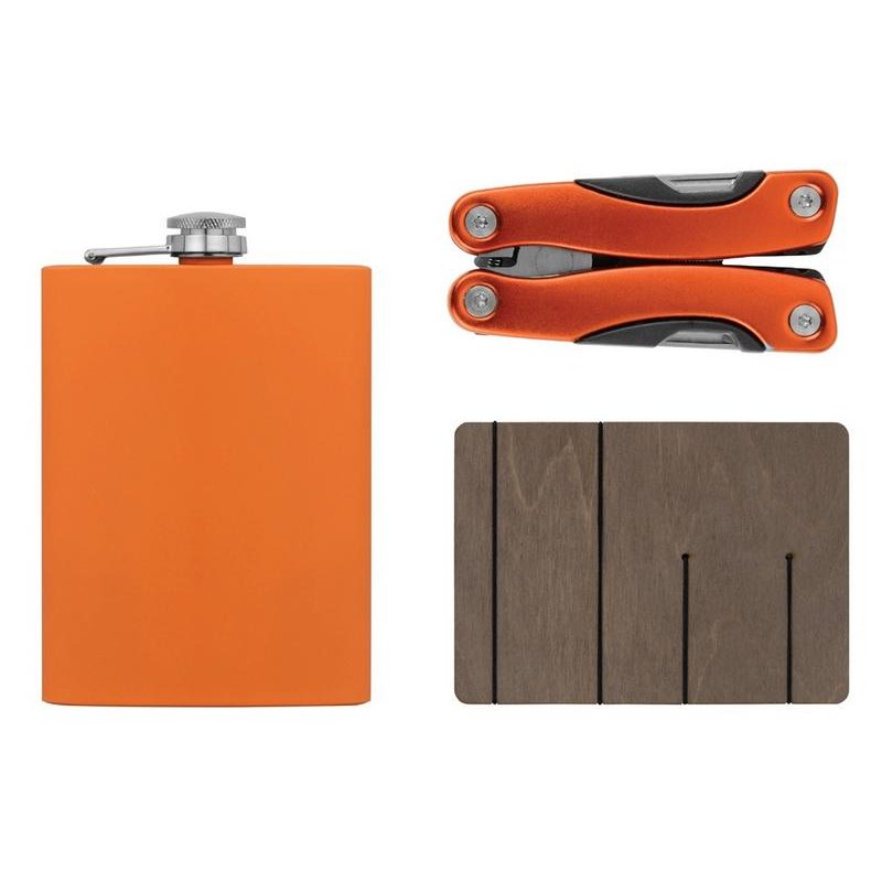 - Материал товара:ложемент - фанера, резинка, фляжка - нержавеющая cталь 304 марки с покрытием soft-touch, мультиинструмент - металл, полиэстер, коробка - картон