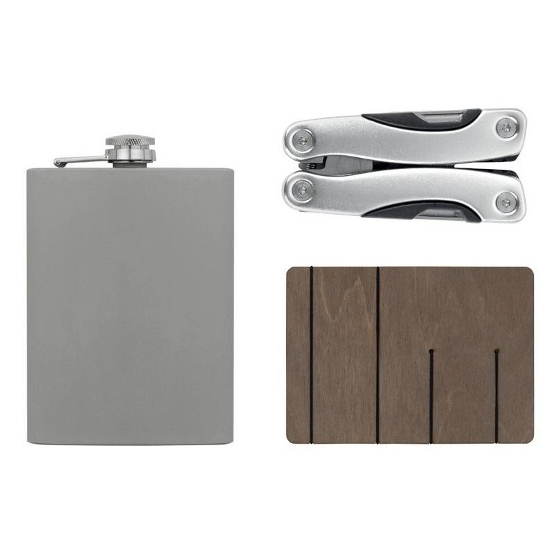 - Материал товара:ложемент - фанера, резинка, фляжка - нержавеющая cталь 304 марки с покрытием soft-touch, мультиинструмент - металл, полиэстер, коробка - картон