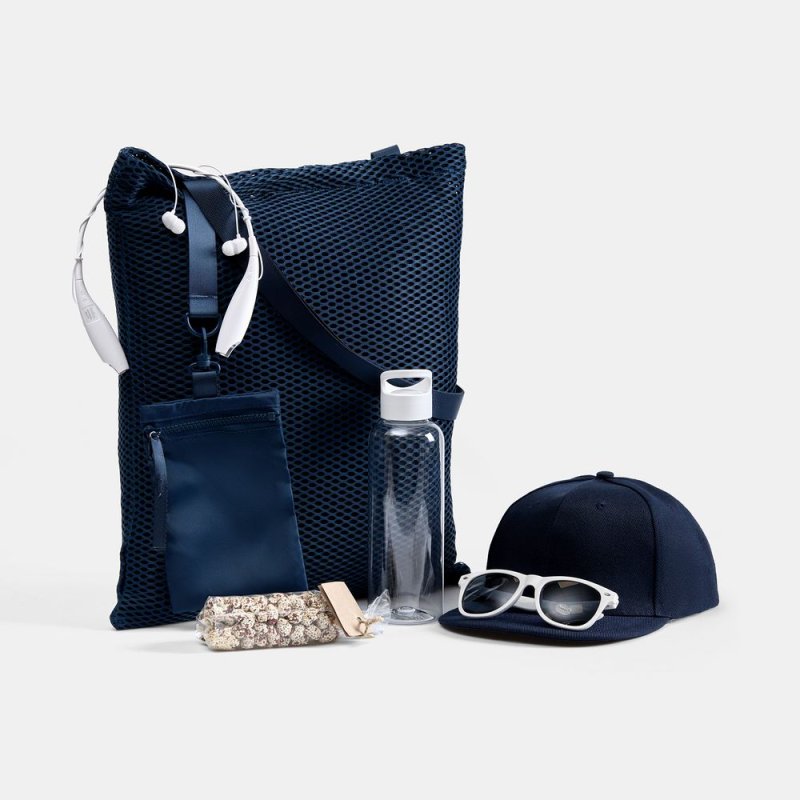 - Материал:шопер - полиэстер, твил 290D с полиуретановой пропиткой; трехслойная сетка; наушники, очки - пластик; бейсболка - полиэстер 100%, плотность 300 г/м²; бутылка - пластик, ПЭТ