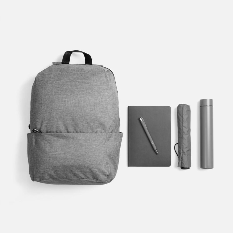 - Размеры:рюкзак: 27x40x14 см; зонт: длина 49 см, диаметр купола 90 см, длина в сложении 22 см; термобутылка: высота 23,5 см, диаметр 4,3 см; блокнот: 15,5х21х1 см; ручка: 13,7х0,8 см