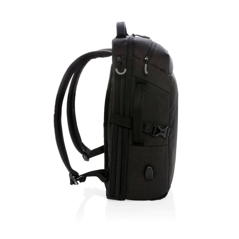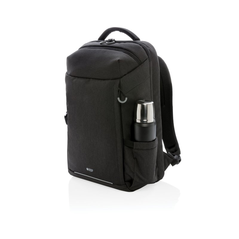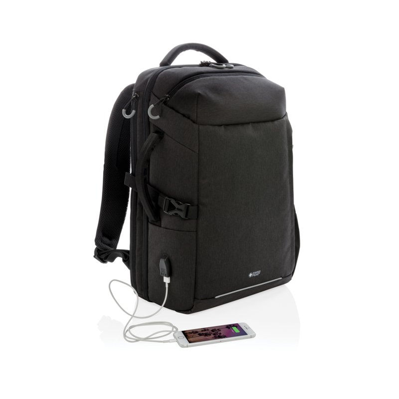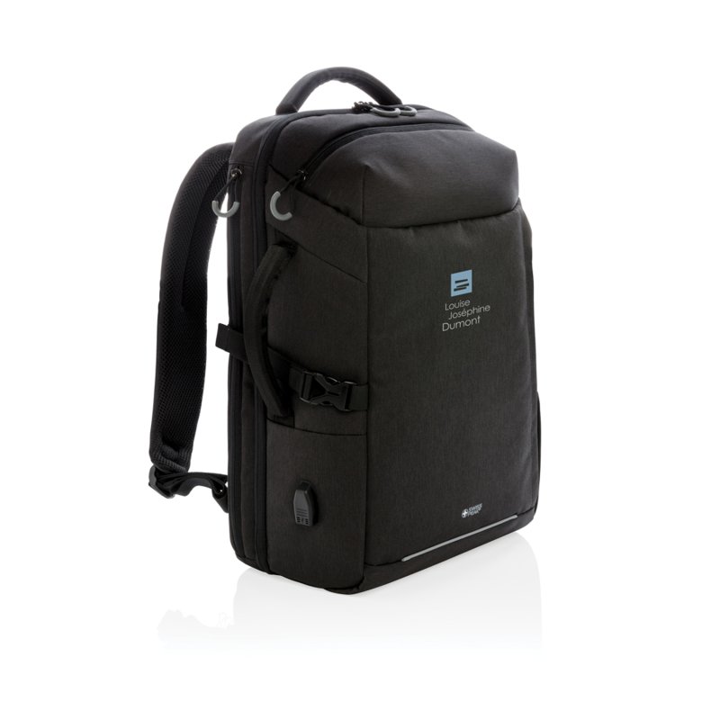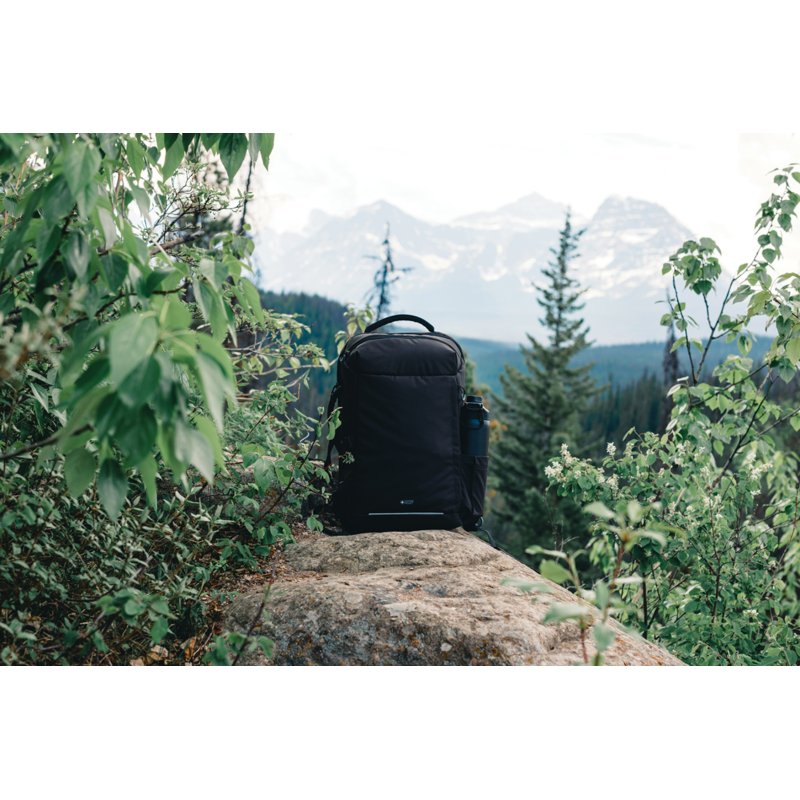 Рюкзак Swiss Peak XXL — это современное решение для командировок, коротких поездок и даже путешествий. Он объединяет вместимость чемодана, комфорт и мобильность рюкзака, а также подходит под большинство стандартов для ручной клади. Внутри есть карман для ноутбука диагональю до 17’’, большое отделение для вещей и несколько карманов. Снаружи располагаются верхний карман, куда можно сложить все необходимое под рукой, а также карманы для карт, паспорта и кошелька с RFID-защитой — она не позволит злоумышленникам считать данные. Для бутылки с водой предусмотрен боковой карман, а для комфортного путешествия с чемоданом — багажный ремень на спинке. Дополнительное удобство обеспечивает встроенный порт USB-A. Рюкзак можно носить как сумку благодаря наличию боковой ручки. Рюкзак изготовлен из переработанных пластиковых бутылок и не содержит ПВХ. Для создания каждого рюкзака мы использовали 35,5 поллитровых пластиковых бутылок. Сертифицировано AWARE™. Наличие индикаторных частиц AWARE™ подтверждает, что мы действительно используем переработанные материалы. 2% с продажи каждой вещи, отмеченной сертификатом AWARE™, мы перечисляем в поддержку всемирной организации Water.org.