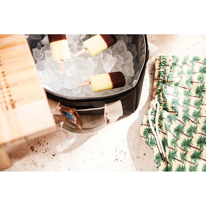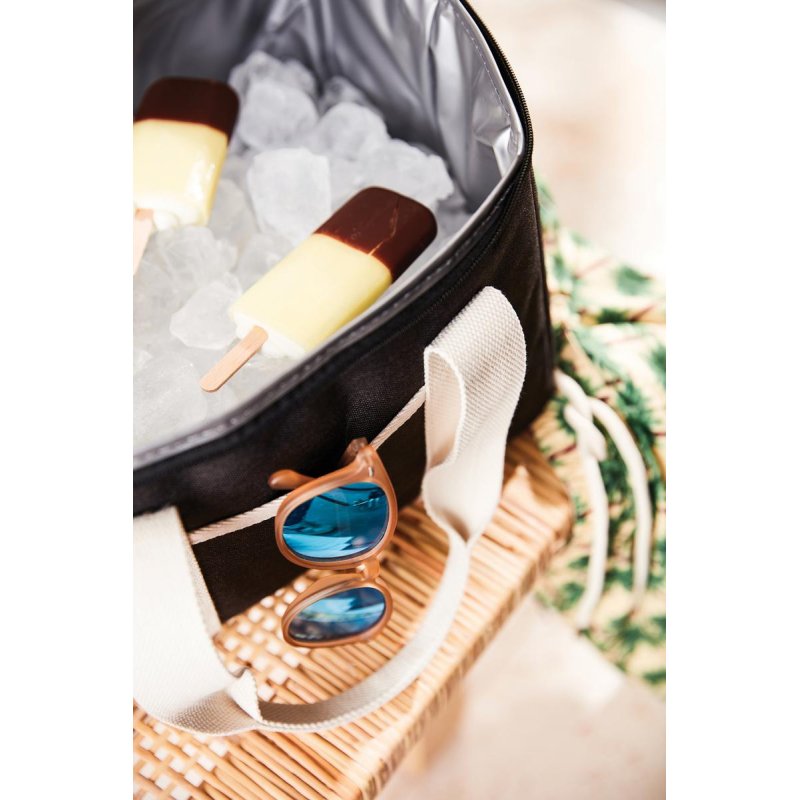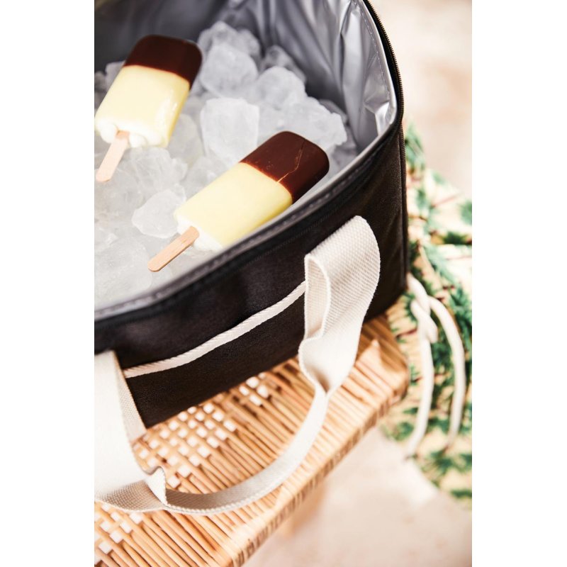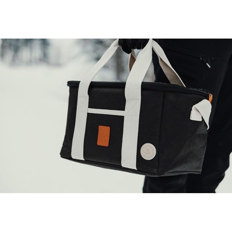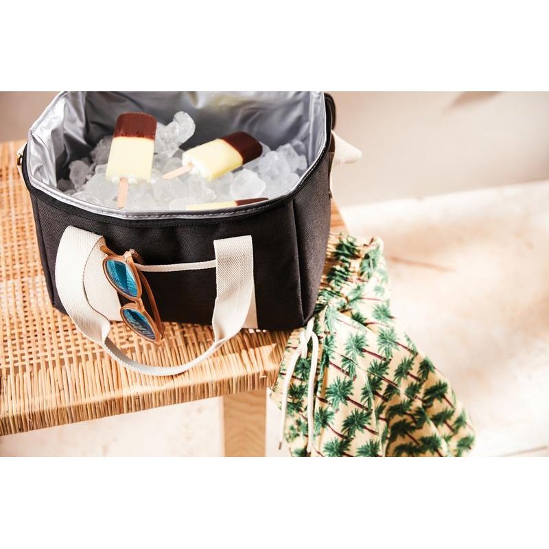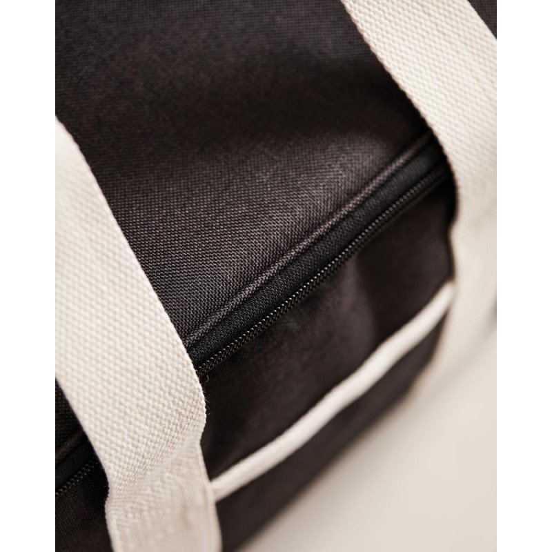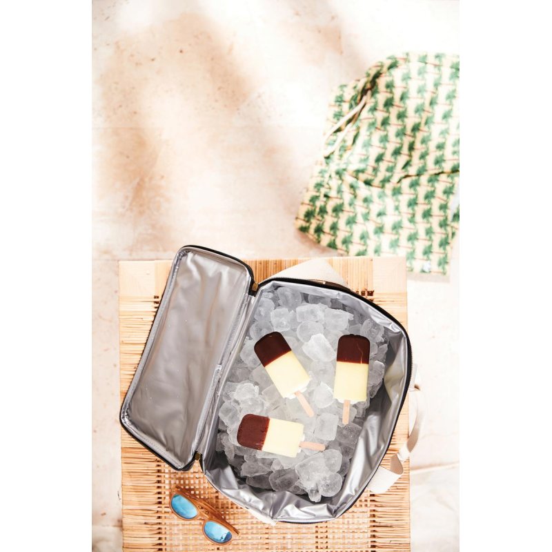 Это универсальная сумка-холодильник с контрастными деталями на 50% изготовлена из rPET, переработанных пластиковых бутылок. Снаружи есть небольшое отделение для важных мелочей. Благодаря плотному подкладу из PEVA сумка легко моется и долго сохраняет холод. Есть регулируемый плечевой ремень и короткие ручки.