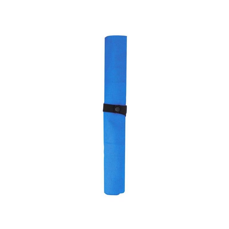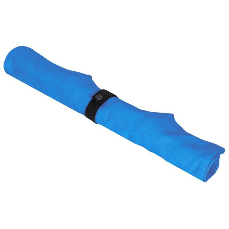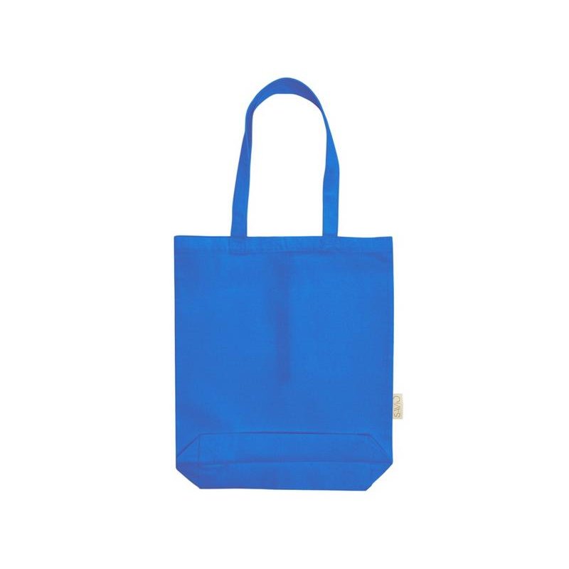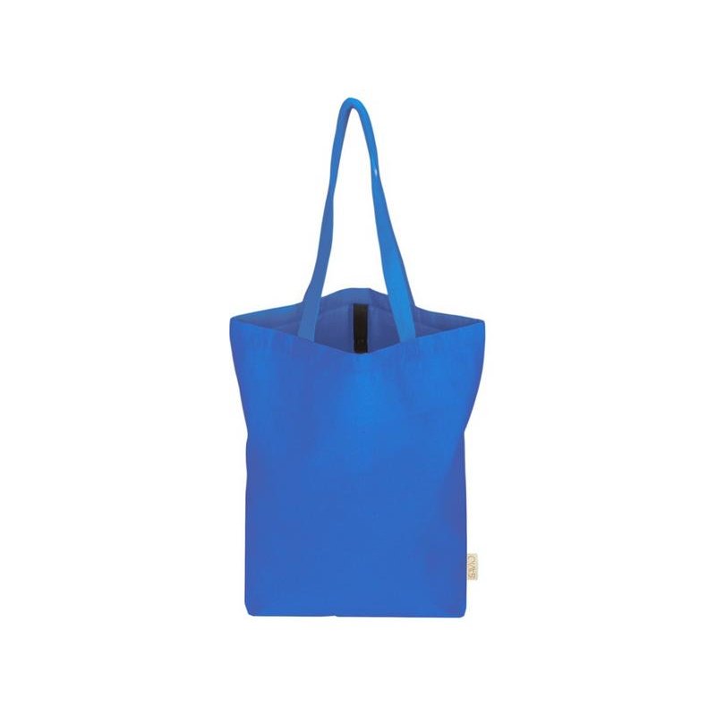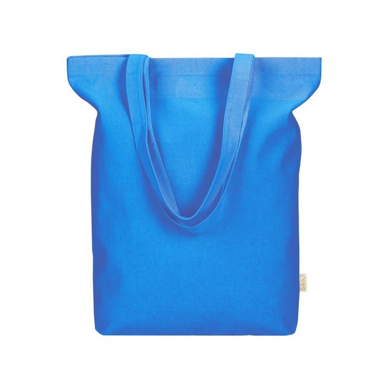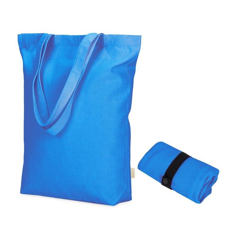 Удобная сумка-шоппер из переработанного хлопка. Можно хранить в сложенном виде и фиксировать с помощью эластичной ленты, застегивающейся на кнопку.