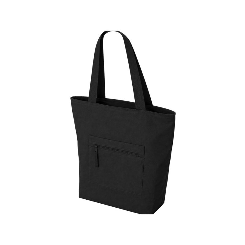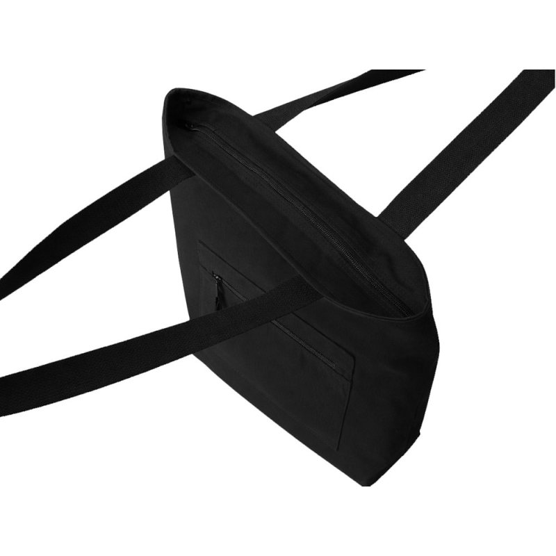 Преимущество этой сумки в наличии застежки молнии на основном отделении - ее содержимое остается закрытым. Донная складка увеличивает вместимость. Снаружи расположен карман на молнии. Парусиновые ручки в тон сумки.
