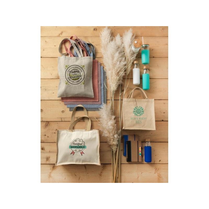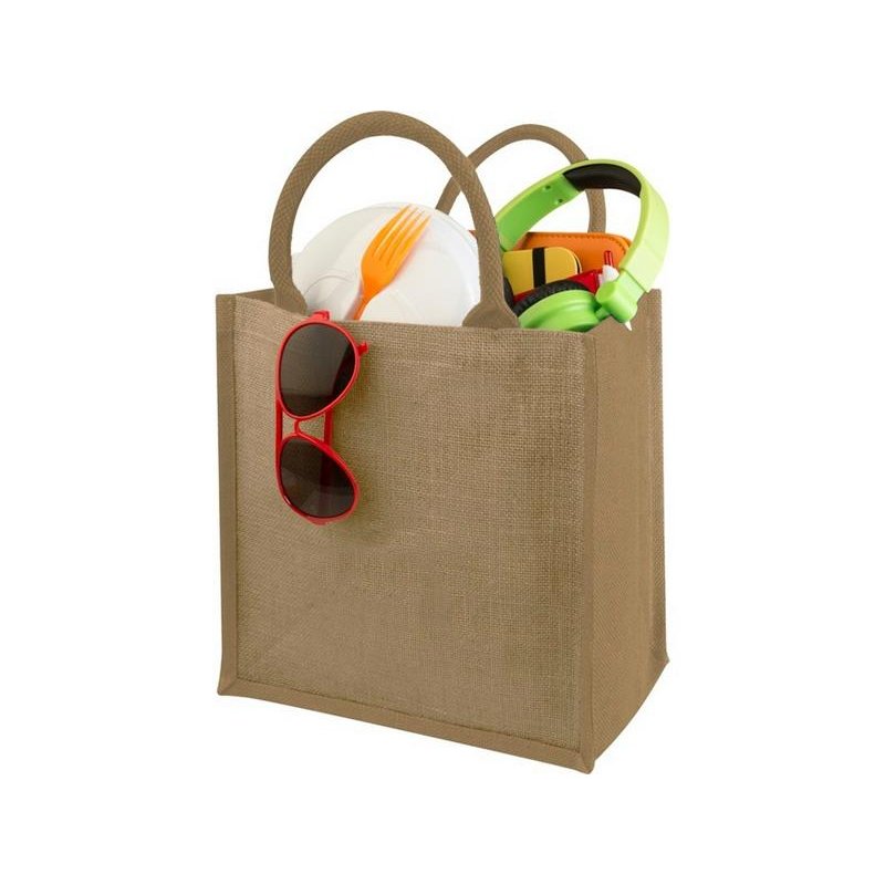 Джутовая подарочная сумка с ламинированным открытым основным отделением, которое застегивается на липучку. Хлопковые ручки высотой 11,5 см.