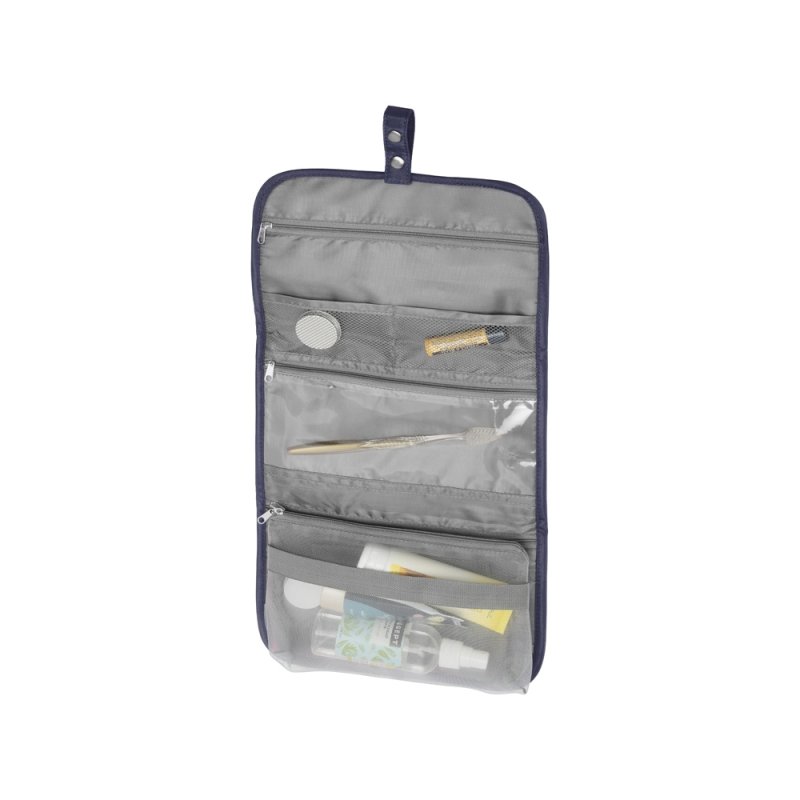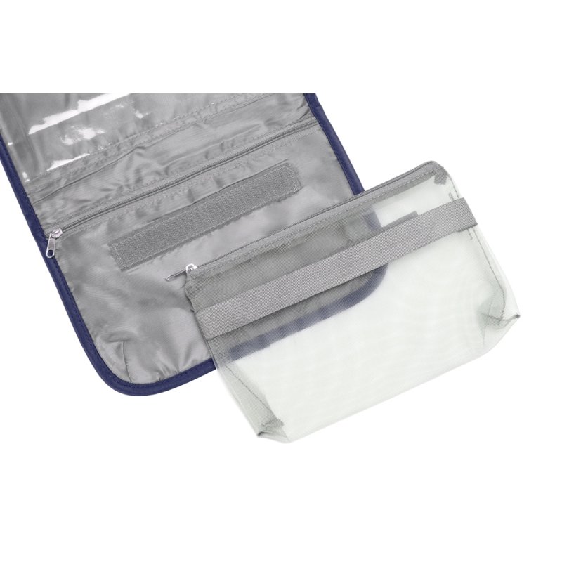 Органайзер состоит из карманов на молнии, карманов-сеток, прозрачного моющегося кармана на молнии, в который можно поместить флаконы с жидкостью — даже если емкость разгерметизируется, карман легко очистить под струей воды.
