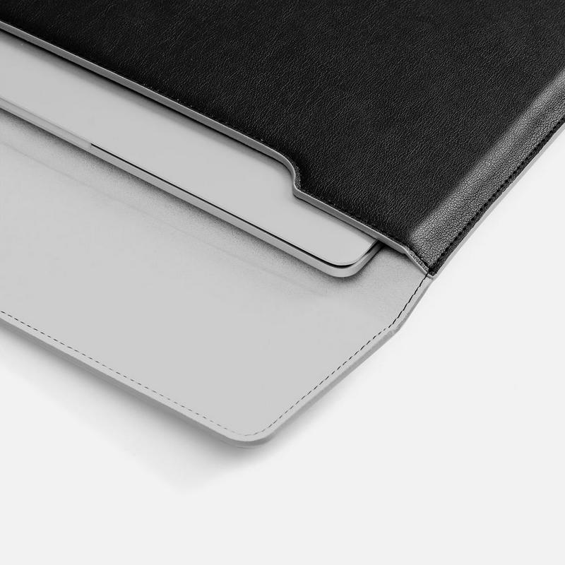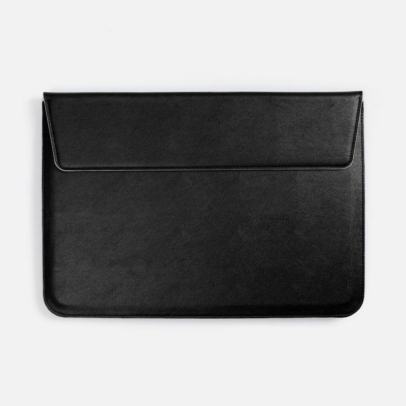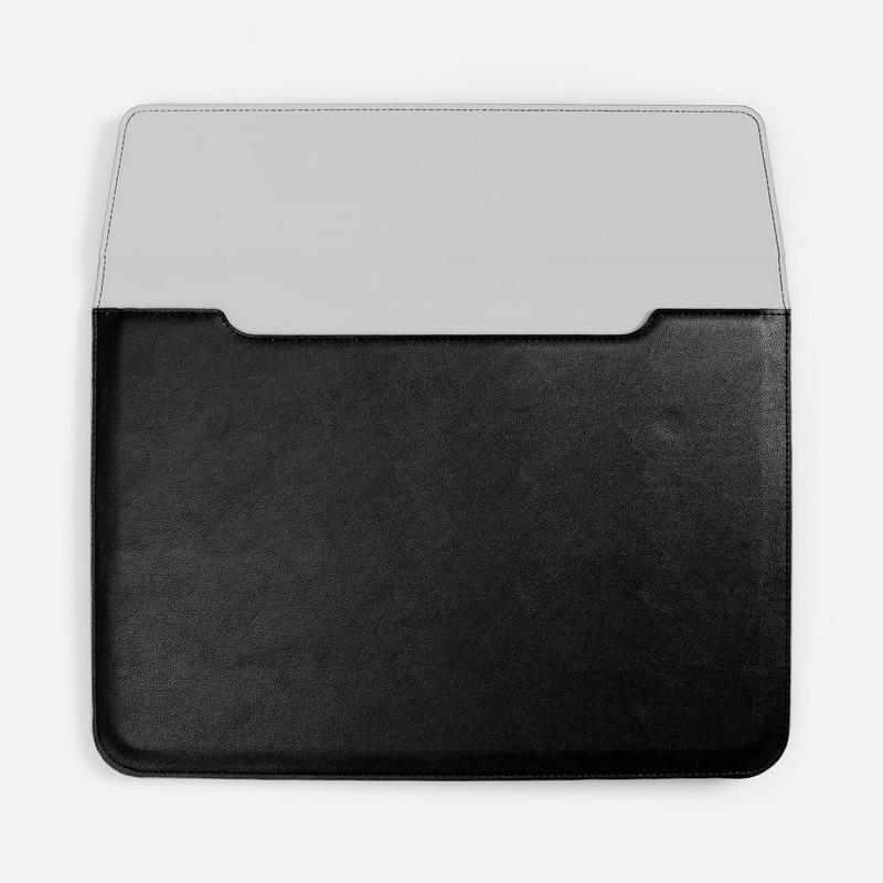 Чехол для ноутбука с диагональю до 15,6" выполнен из материала Petrus, черного цвета, дополнен окрашенным срезом края серого цвета.