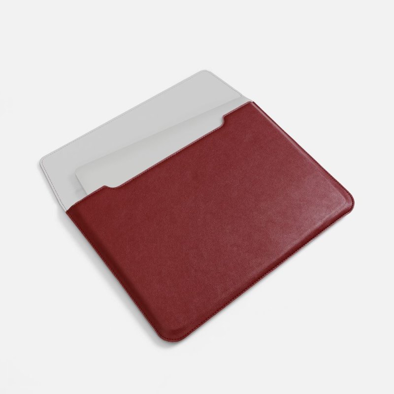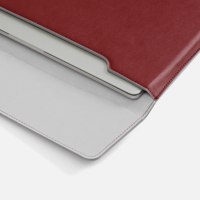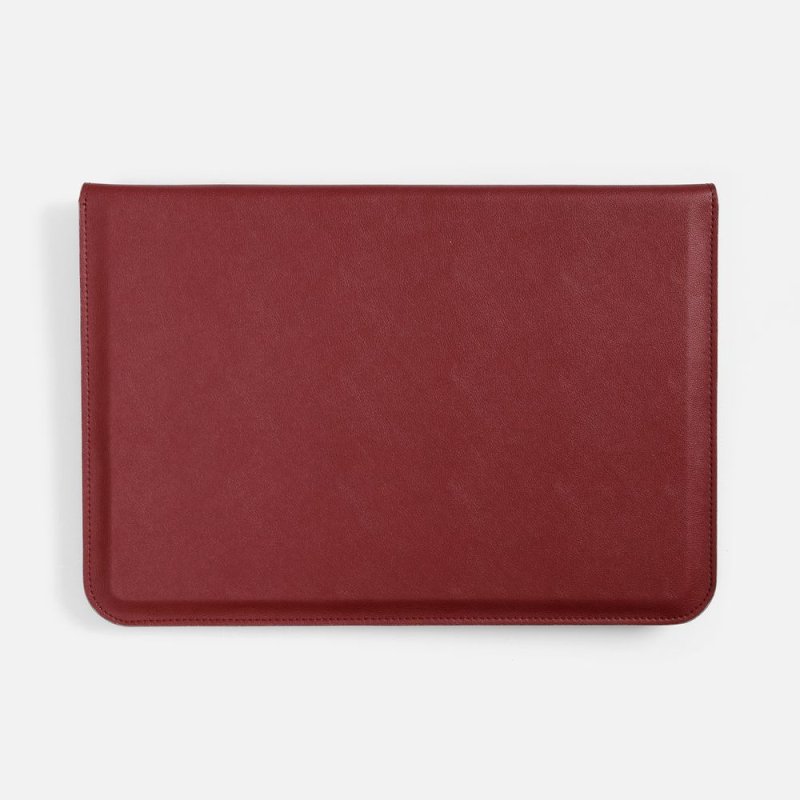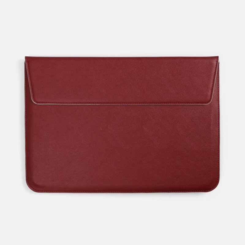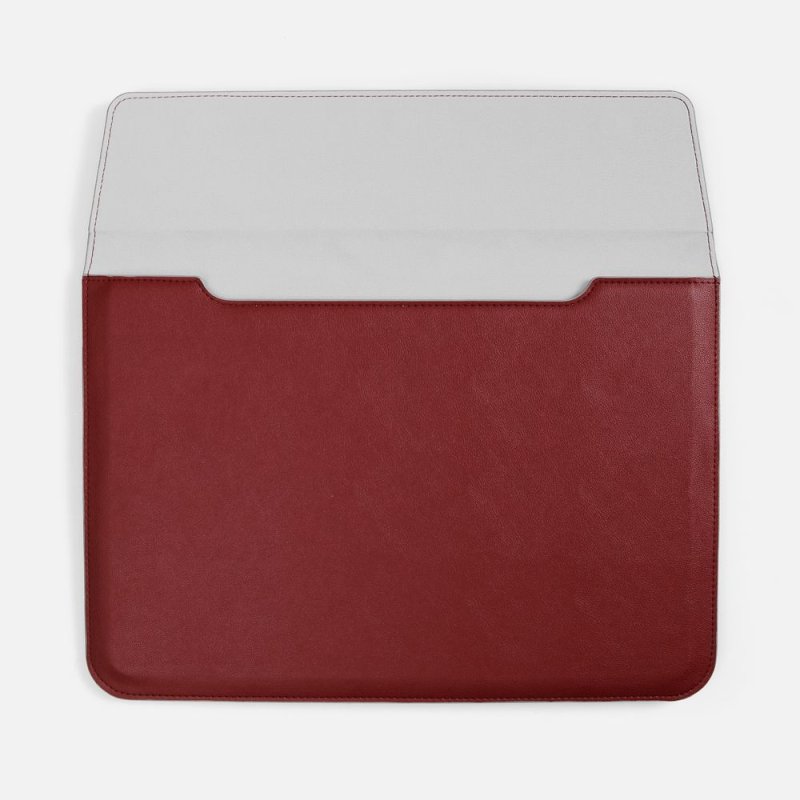 Чехол для ноутбука с диагональю до 15,6" выполнен из материала Petrus, красного цвета, дополнен окрашенным срезом края серого цвета.