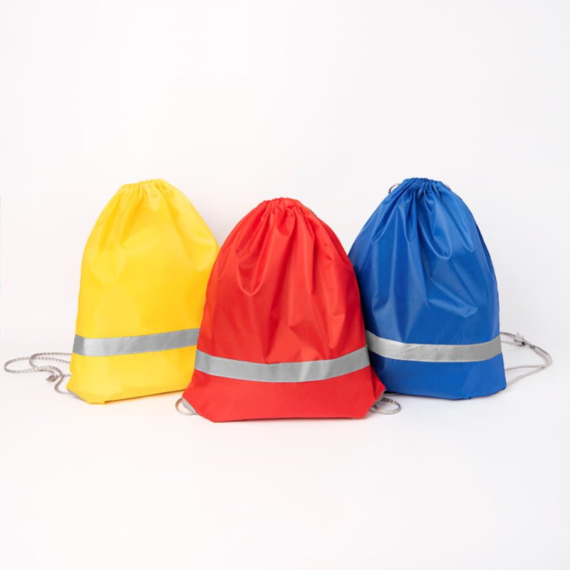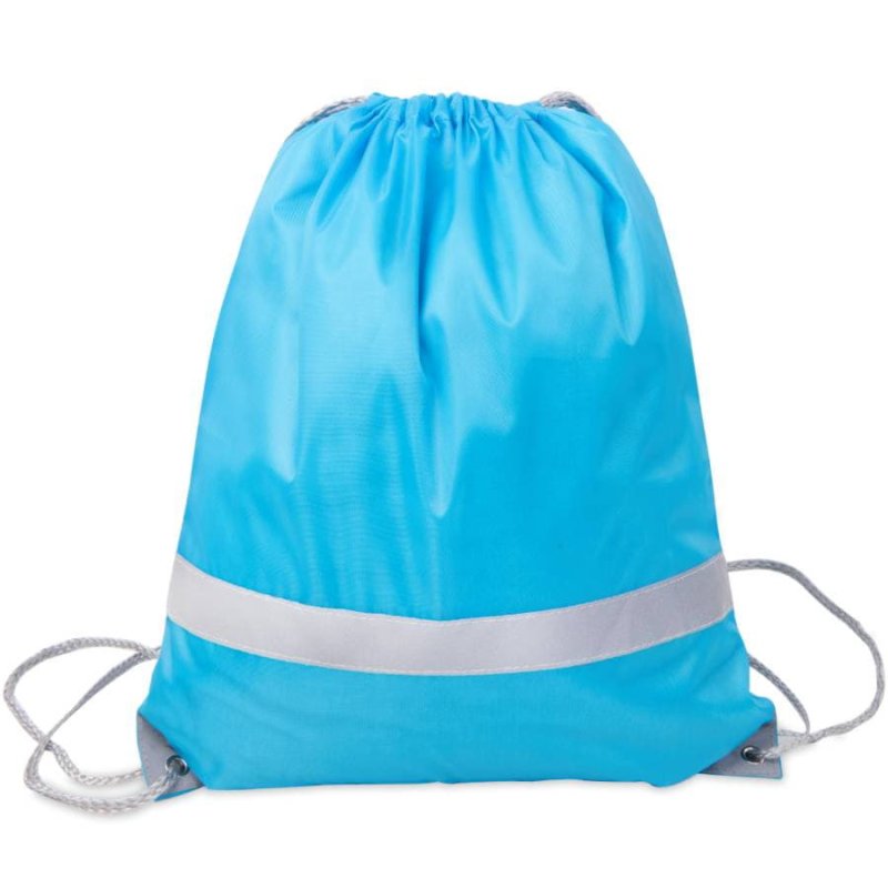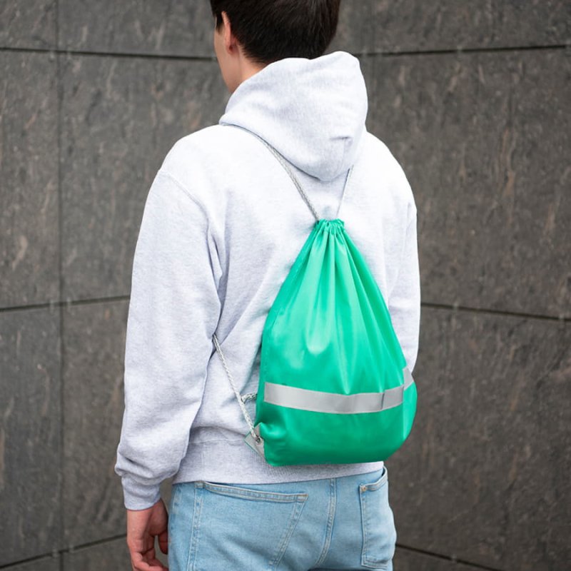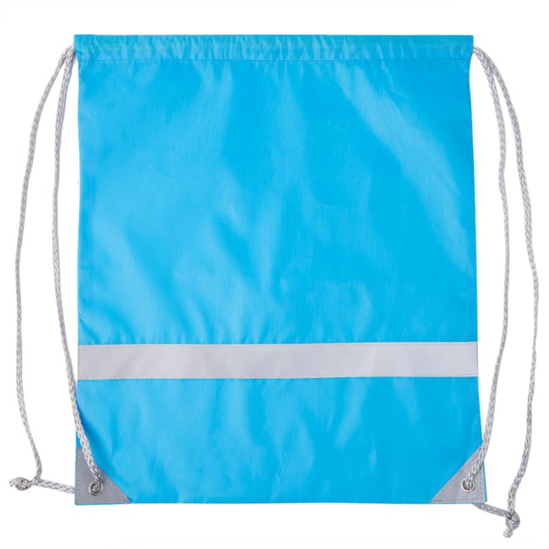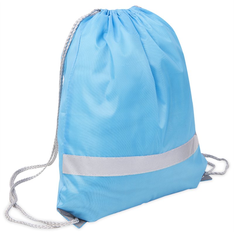 Рюкзак-мешок RAY из полиэстера 210Dсо светоотражающей полосой спереди,светоотражающими уголками,усиленными металлическими люверсамиЛегко и просто затягивается по верхней части серыми шнурами.