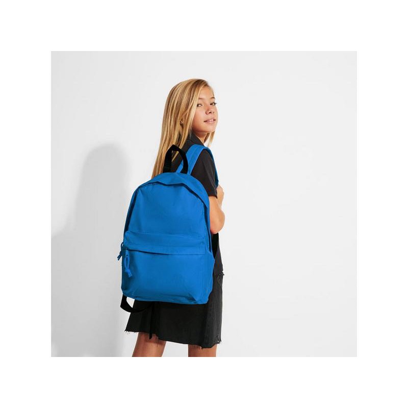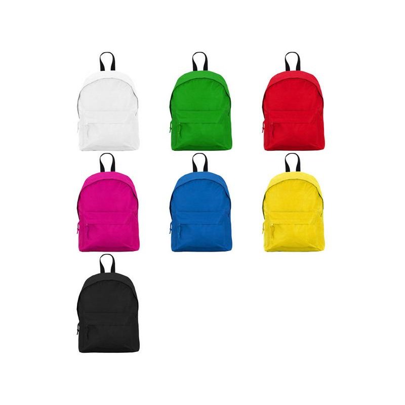 Базовый рюкзак из прочной ткани. Двойной плечевой ремень и контрастная ручка. Два кармана: основной и один спереди с молниями, клапанами и бегунками в тон