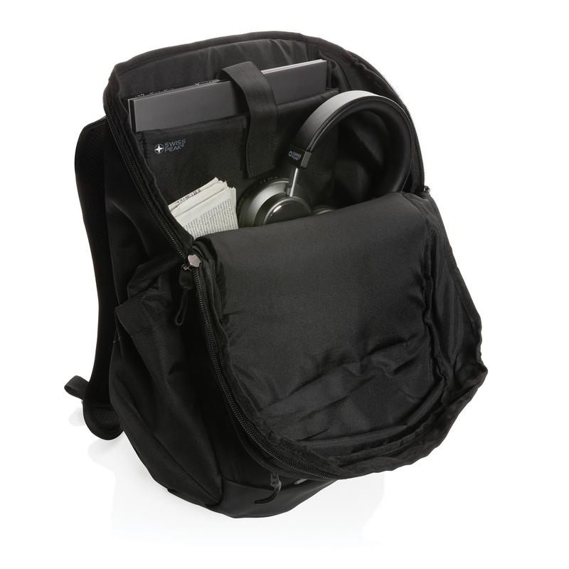 Бизнес-рюкзак Swiss Peak из RPET AWARE™ — это универсальный аксессуар как для работы, так и для небольших поездок. Вместительное основное отделение и быстрый доступ к ноутбуку через боковую молнию. Комфортная посадка благодаря изогнутым лямкам и мягкой спинке, есть дополнительная застежка на груди. Верхний карман на молнии предназначен для всего самого необходимого. Рюкзак выполнен из полиуретана и переработанного полиэстера 1200D. Подкладка: 100% переработанный полиэстер 150D. RPET содержит индикатор AWARE™, что подтверждает подлинность переработанных материалов и экологичность производства. При изготовлении каждого бизнес-рюкзака Swiss Peak мы сэкономили 22,7 л воды и повторно использовали 38,19 пластиковых бутылок объемом 0,5 л. 2% с продаж каждого изделия с индикатором AWARE™ отчисляем в поддержку всемирной благотворительной организации Water.org.