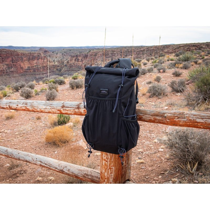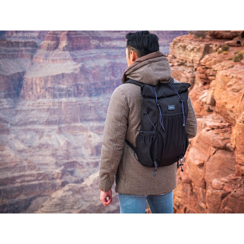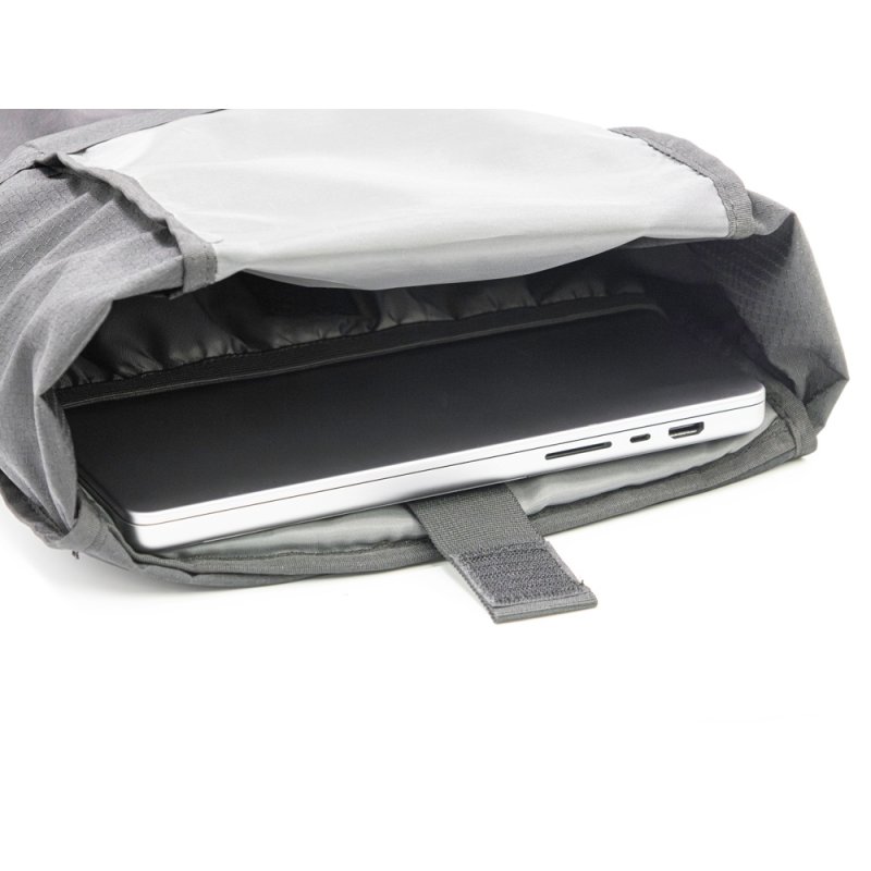 Легкий, элегантный, складывающийся рюкзак вместителен и удобен благодаря системе закрытия основного отделения roll-top, наличию трех наружных карманов спереди и по бокам из прочной эластичной сетки и внутреннему плотному карману для ноутбука до 16. Лямки с эластичными карманами для карт, телефона и других мелочей фиксируются на груди пряжкой, которую можно отрегулировать по высоте под ваш рост. Эластичные фиксирующие шнурки имеют светоотражающее нанесение, что обеспечивает дополнительную защиту в темное время суток. Дышащая сетка на спинке обеспечивает удобство и комфорт. На нагрудной пряжке предусмотрен свисток для экстренного случая. Водостойкая ткань верха изготовлена из переработанного пластика, пропитана специальным составом против загрязнения. В комплекте металлический шильд для нанесения вашего логотипа.